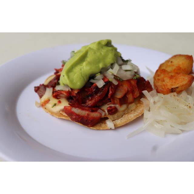 Tostada de maíz con queso gratinado, trompo de pastor, guacamole y cebolla con cilantro. Nota: Puede suavizarse durante el envío a domicilio.