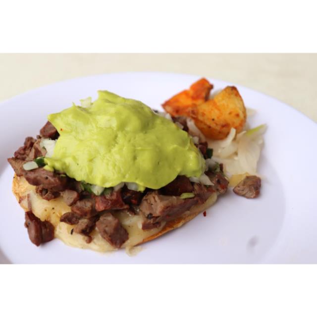 Tostada de maíz con queso gratinado, arrachera con longaniza, guacamole y cebolla con cilantro. Nota: Puede suavizarse durante el envío a domicilio.
