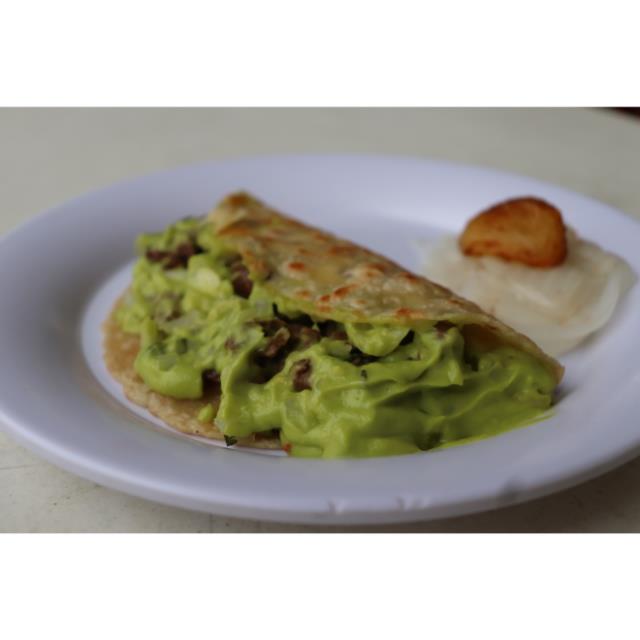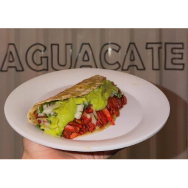 Tortilla de harina artesanal con queso hecho costra, trompo de pastor, guacamole y cebolla con cilantro.