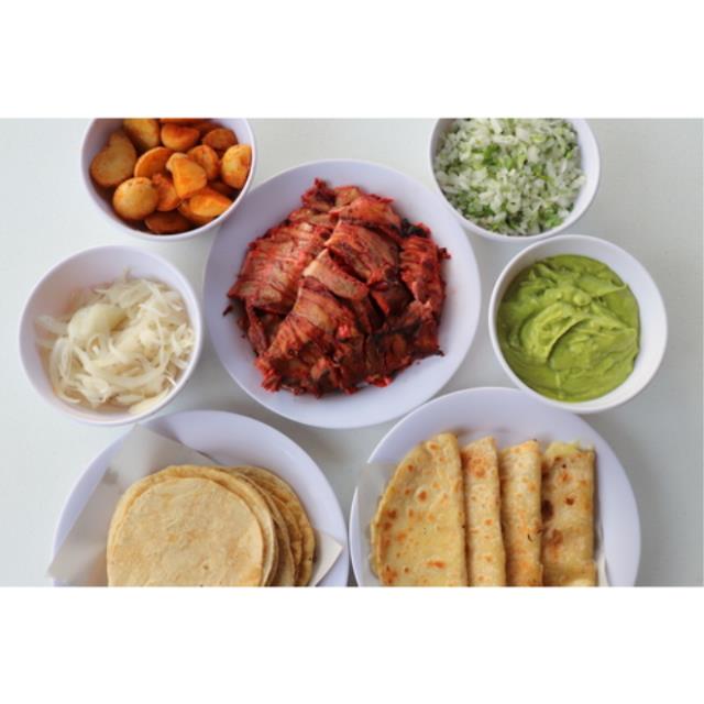 Trompo de pastor acompañado de 2 quesadillas, media orden de guacamole, cebollita asada, papita cambray, tortillas y salsas.