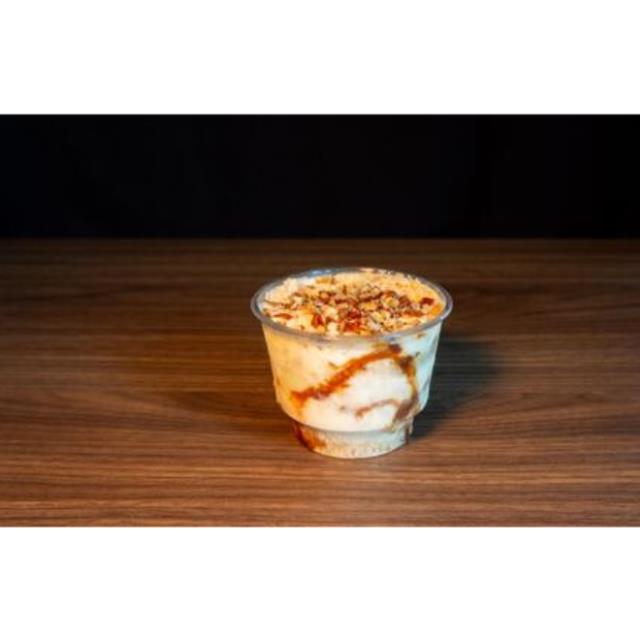 Capas de helado de vainilla con galleta hojaldrada con cajeta, coronado con nuez (295 ml)