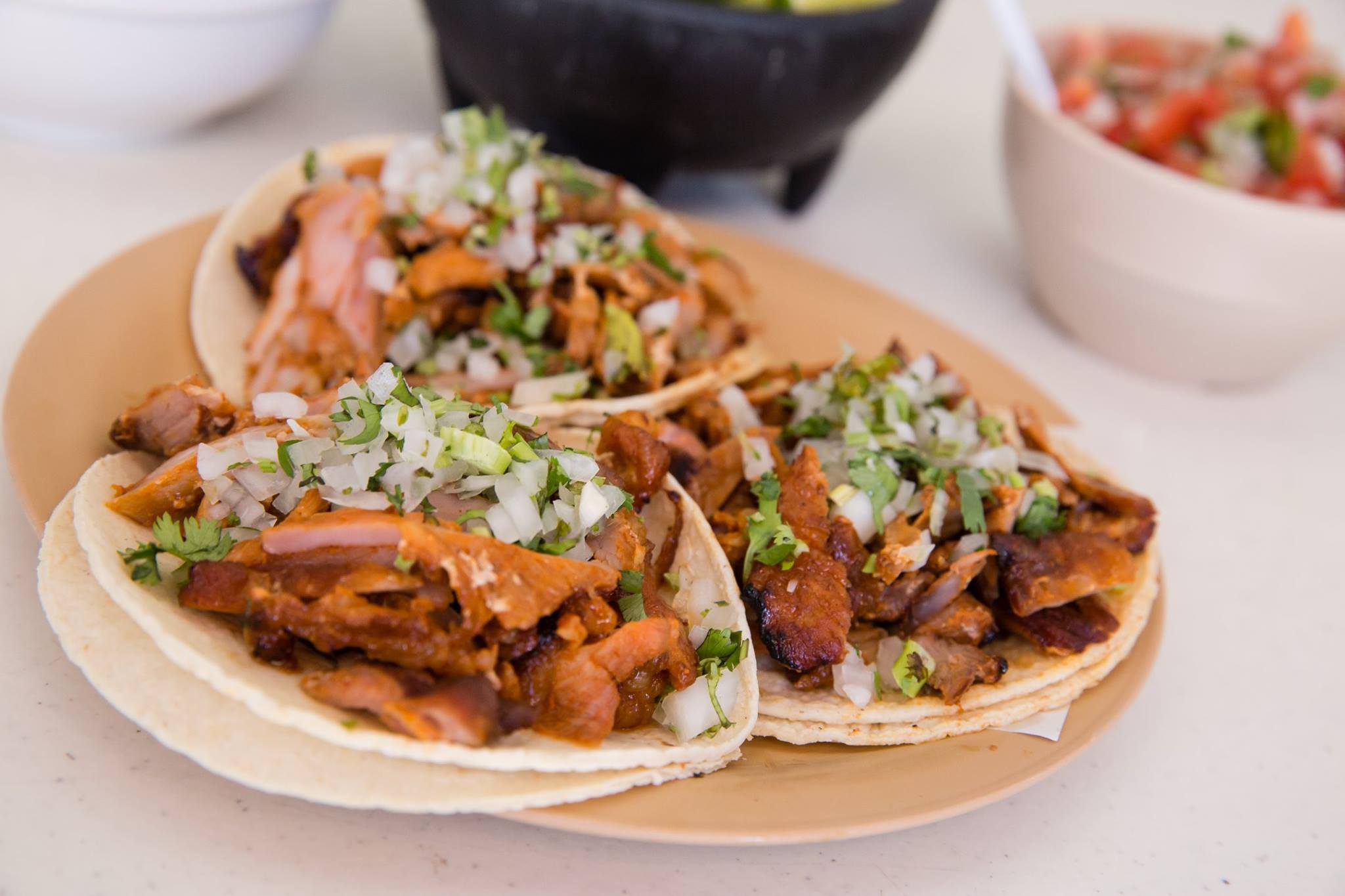Delicioso taco en tortilla de maíz bien servido, con su cebolla y cilantro, acompañado de sus salsas.