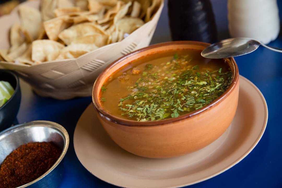 Rico consomé bien servido de un litro, acompañado de su salsas de la casa , cebolla, cilantro y 9 a 11 tortillas de harina de maiz . 120Gr de carne