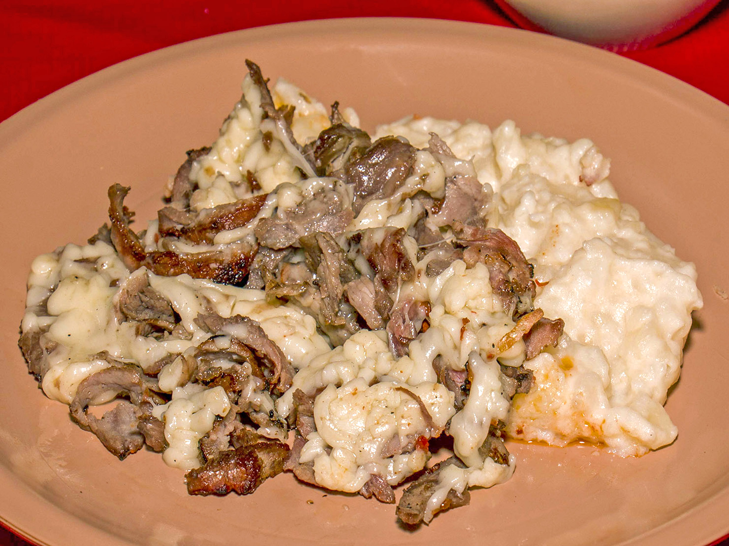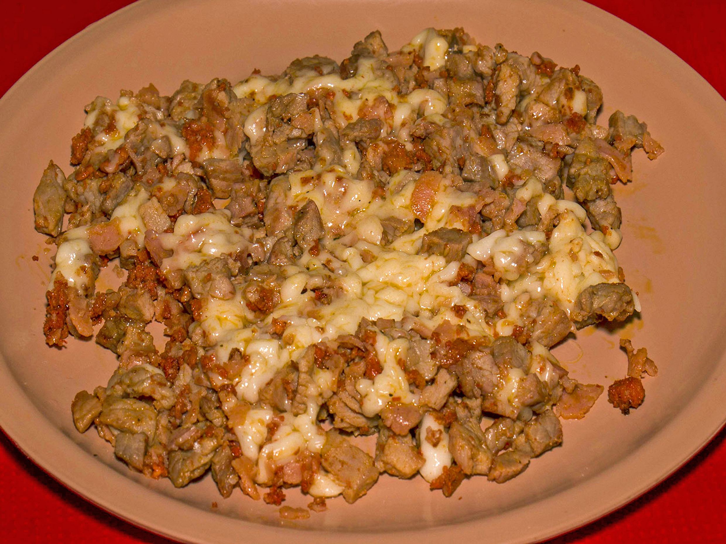 Carne de chuleta pasada a la plancha con 2 quesos ( chihuahua y gouda ) servida en pure de papa acompañada de tortillas, salsas y limones