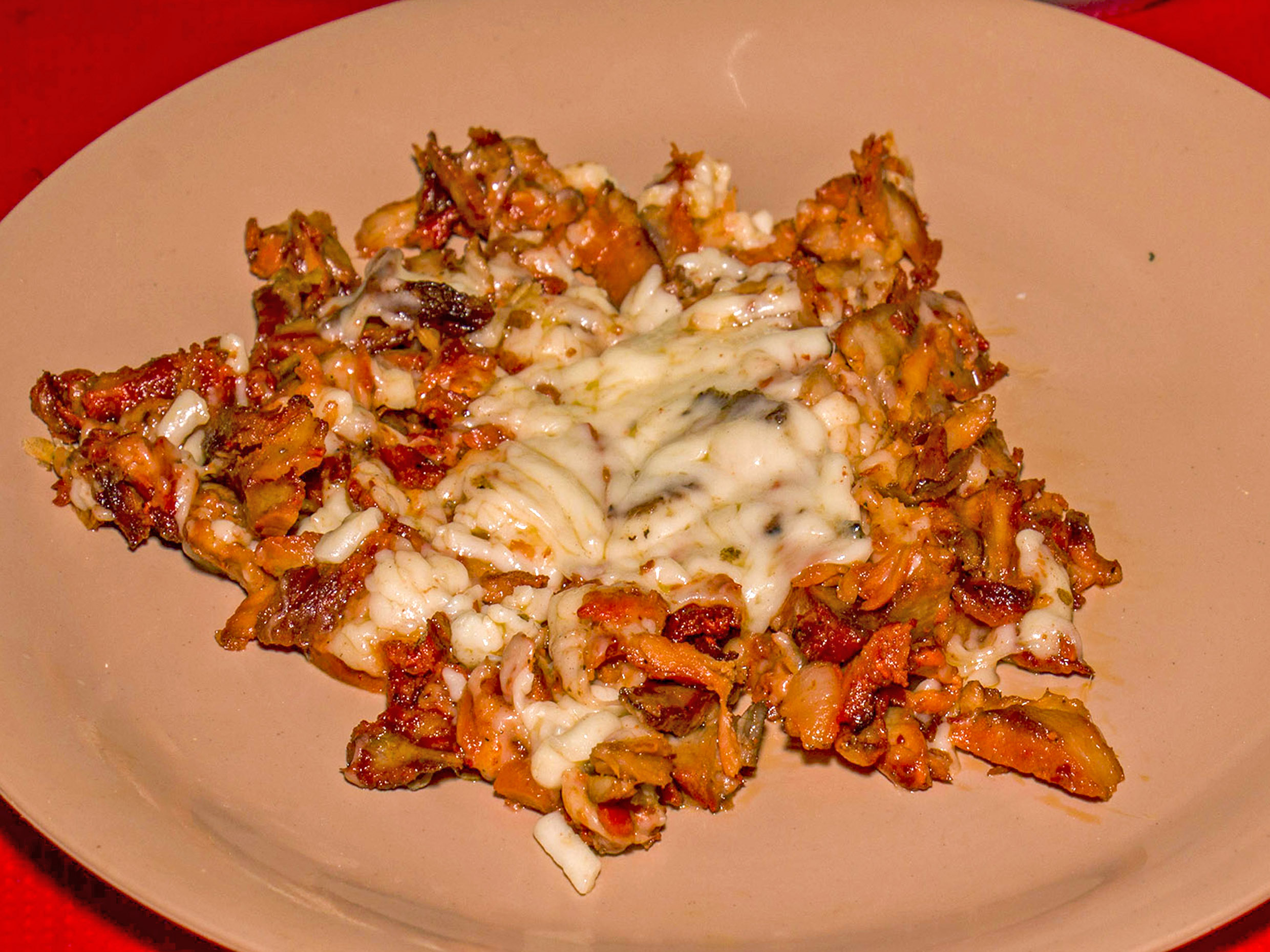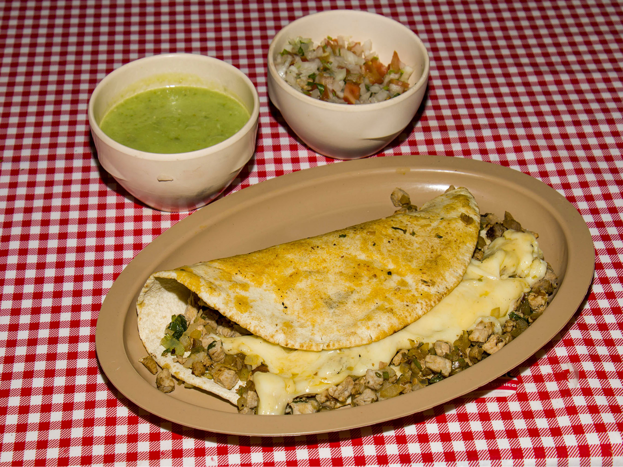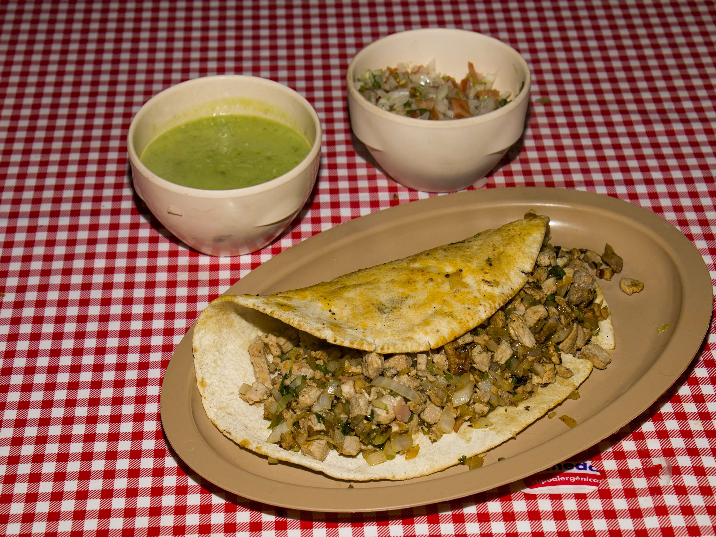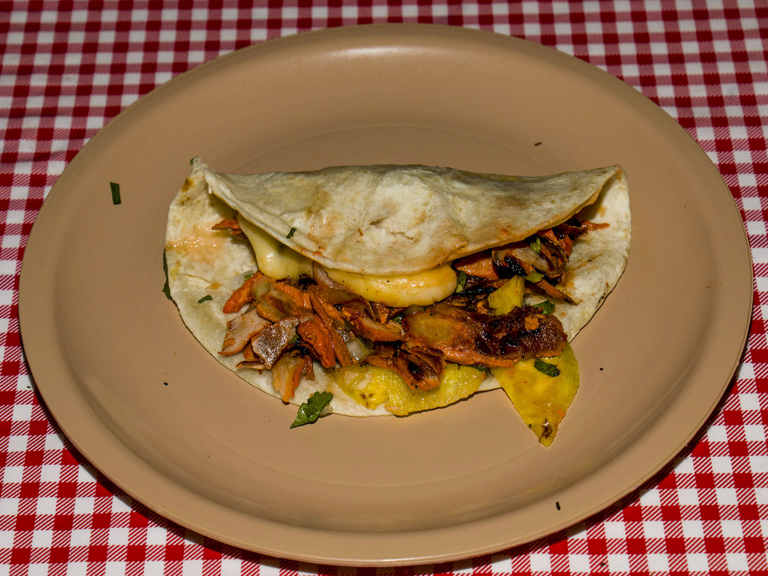 Deliciosa carne de chuleta de cerdo precosida a la plancha con cebolla y cilantro con 2 quesos ( chihuahua y gouda) , servida en tortilla de Pan Pita