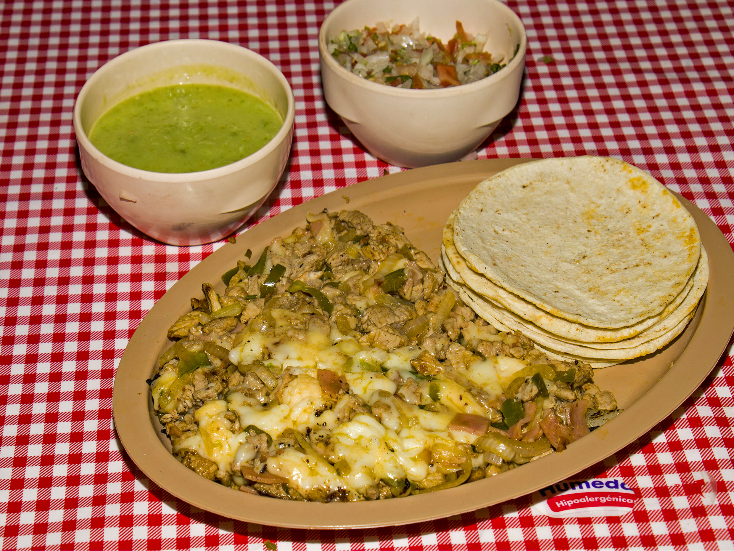 Especialidad de la casa para 4 personas, echa de deliciosa carne de pastor, sirloin, chuleta, tocino, jamon, chorizo, cebolla, champiñones, chile morron, mezclado con 2 quesos ( chihuahua y gouda), incluye tortillas, salsas y limones.