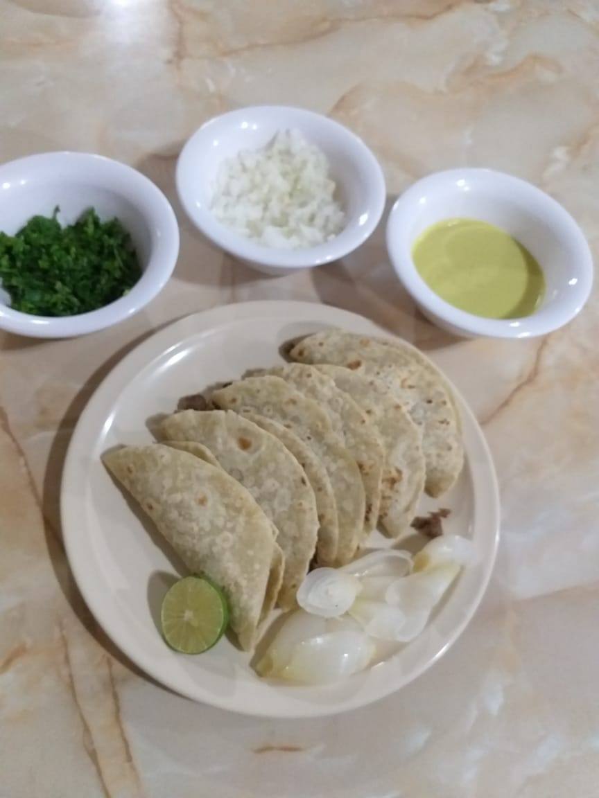 Deliciosos Tacos servidos en tortilla de harina con carne al pastor preparada a la plancha, servios con todo (Cebolla, Cilantro, y Piña) o naturales