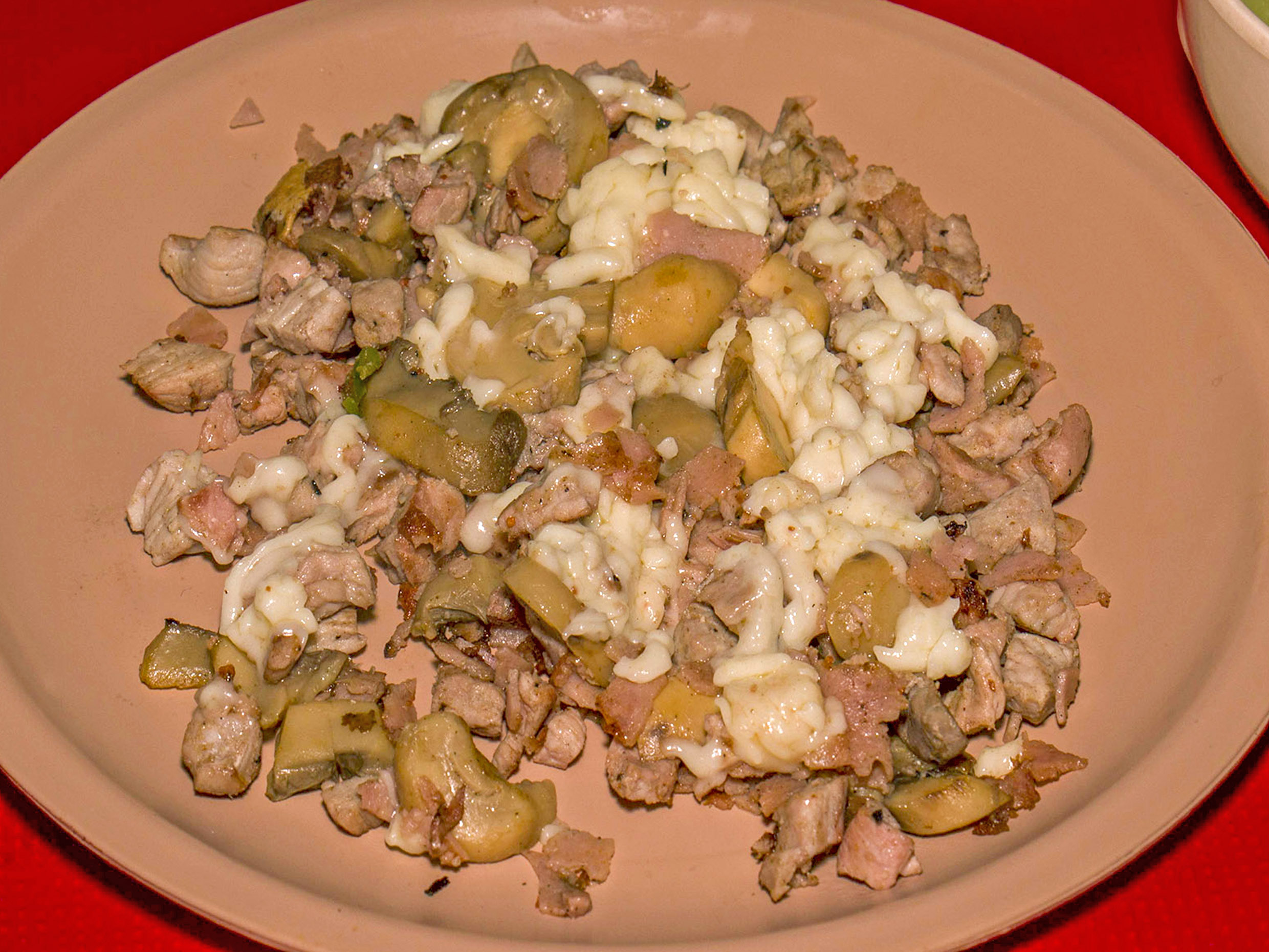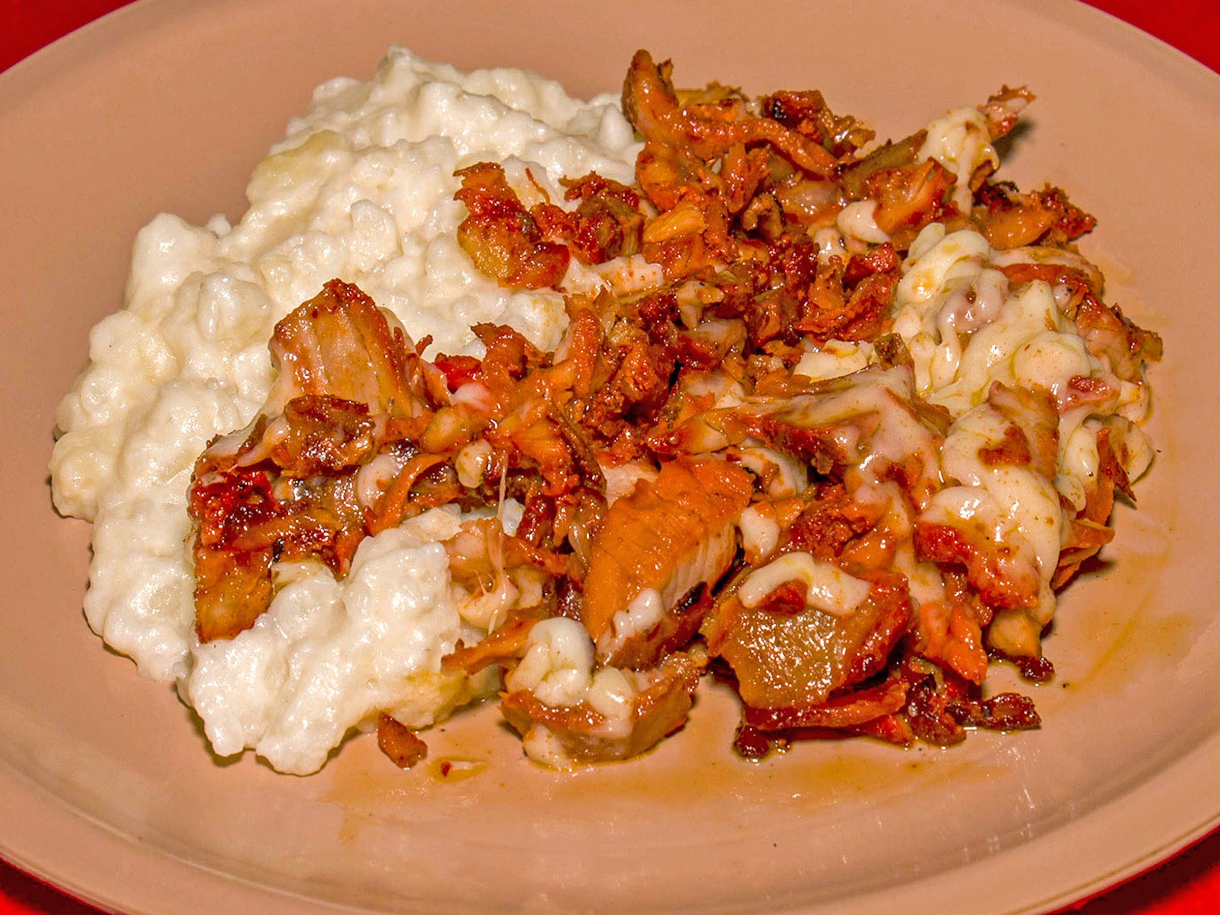 Deliciosa carne de chuleta de cerdo precosida a la plancha con cebolla y cilantro con 2 quesos ( chihuahua y gouda) , servida en pure de papa, acompaña de tortillas
