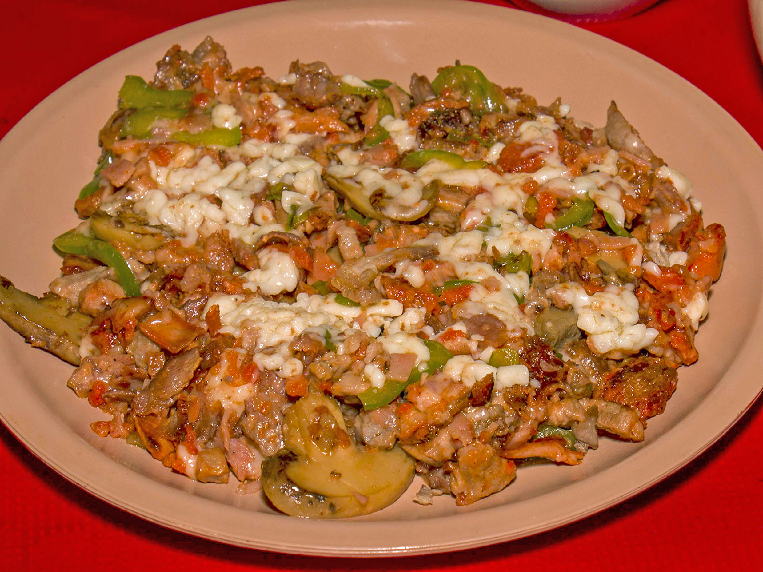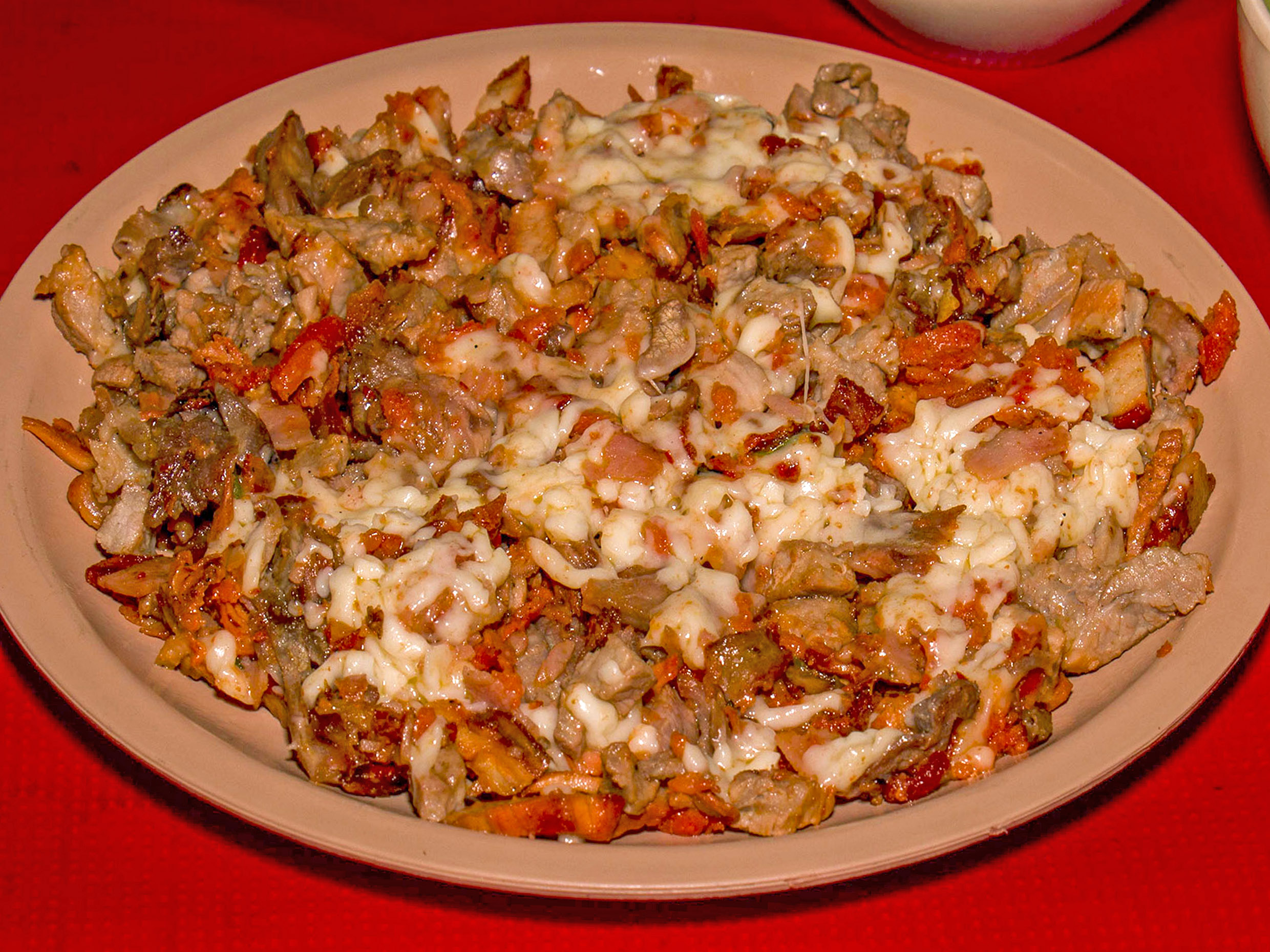 Es pecialidad para 2 personas echa de deliciosa carne de pastor pasada a la plancha con sirloin, chuleta, chorizo,champiñones, chile morron, salchichas y jamon mezclado con 2 quesos ( chihuahua y gouda) incluye tortillas, salsas y limones