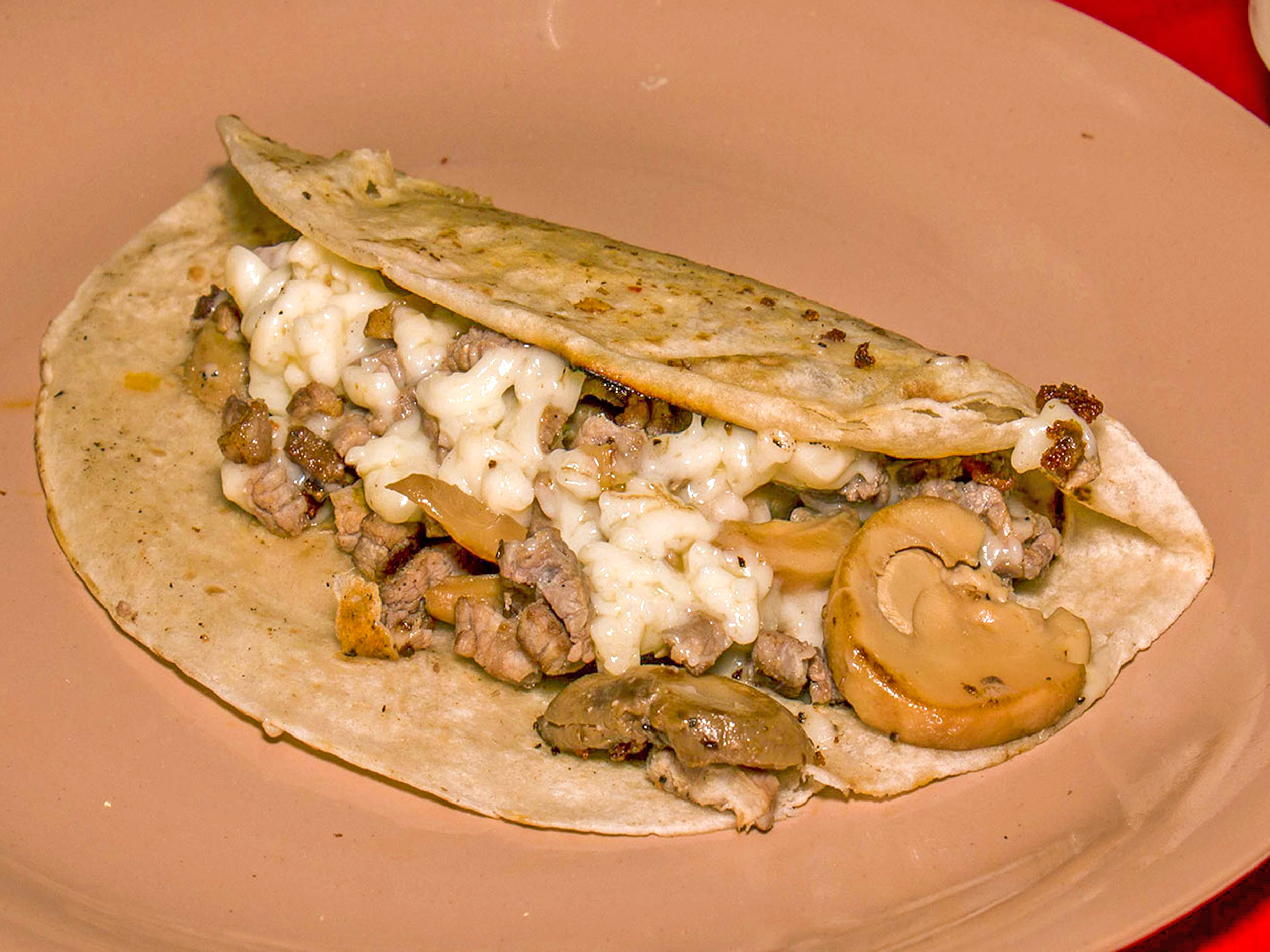 Deliciosa gringa servida en tortilla de harina con carne asada con champiñones, con 2 quesos (chihua y ouda) servidas con todo (Cebolla, Cilantro, y Piña) o naturales