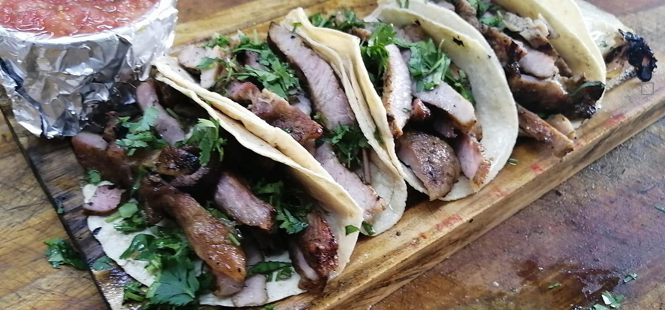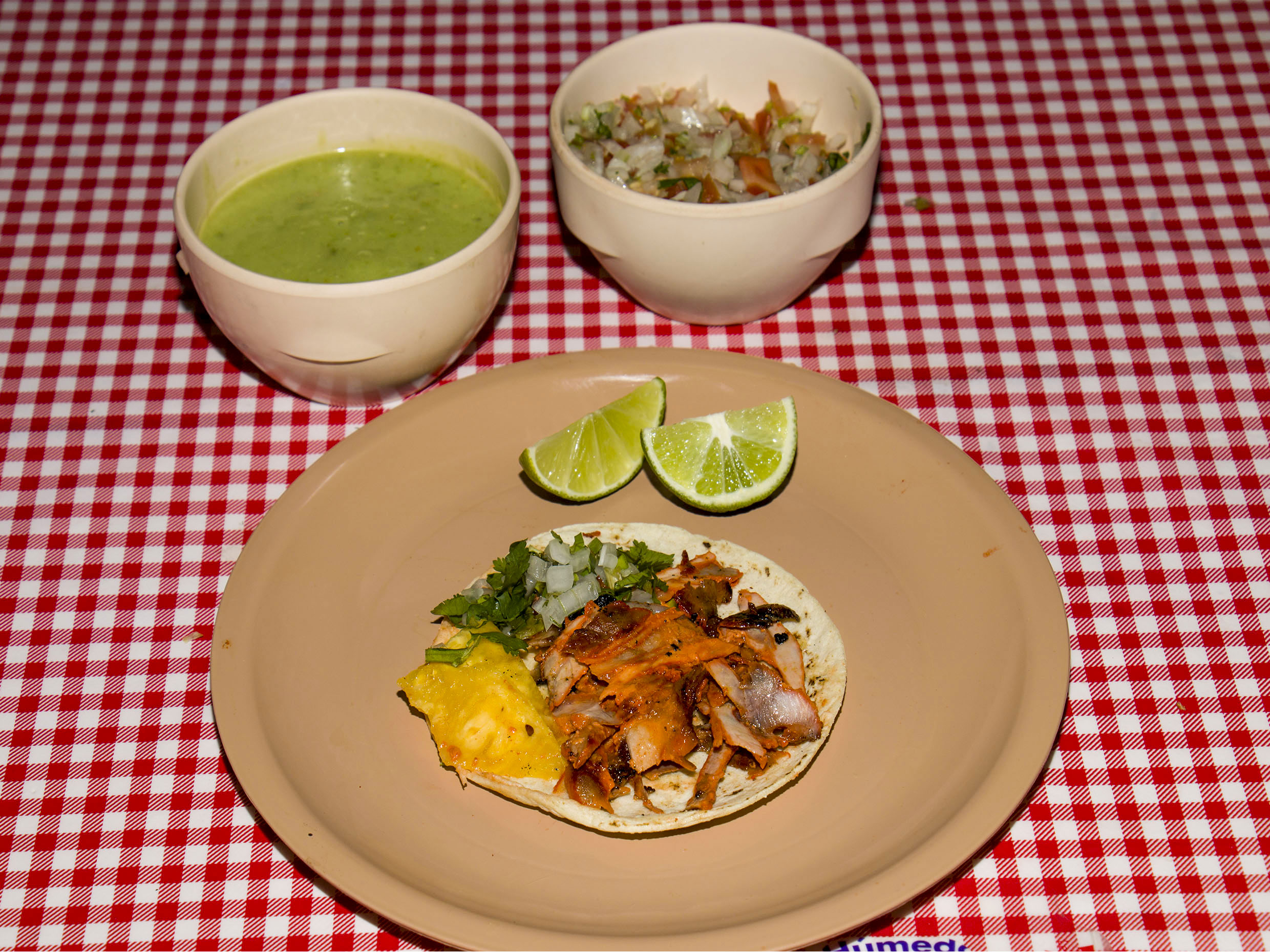 Deliciosos Tacos servidos en doble tortilla de maiz con carne de cerdo preparada a la plancha, servios con todo (Cebolla, Cilantro, y Piña) o naturales