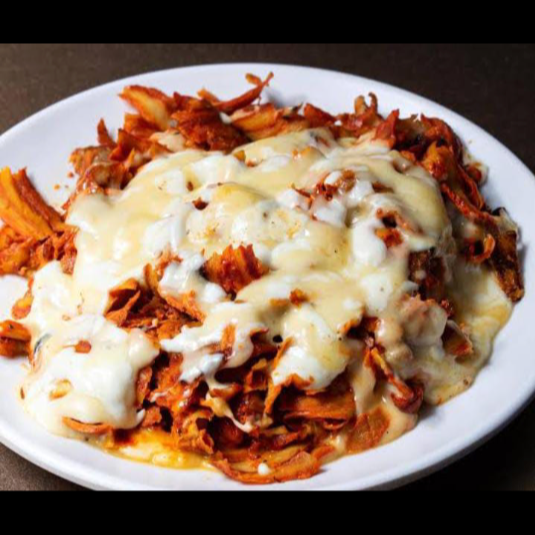 Medio kilo de carne al pastor con queso Oaxaca fundido, acompañado de tortilla, cebolla con cilantro y salsa.
