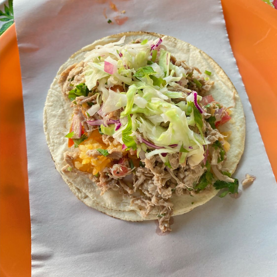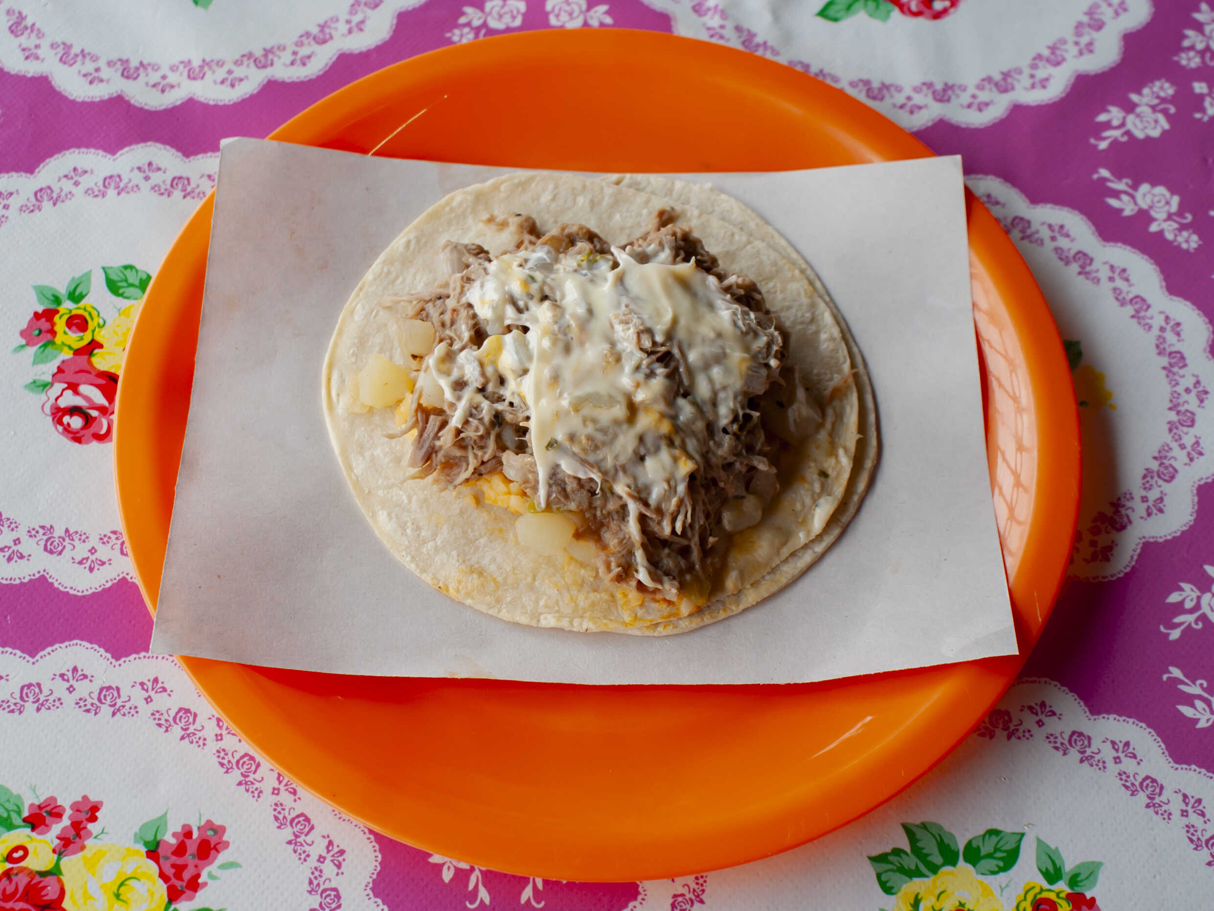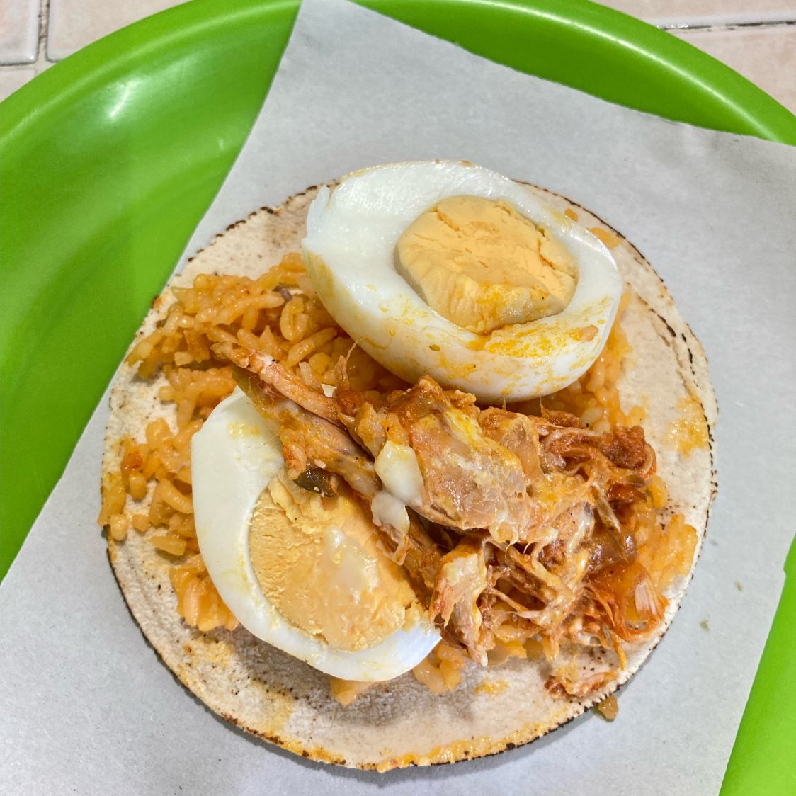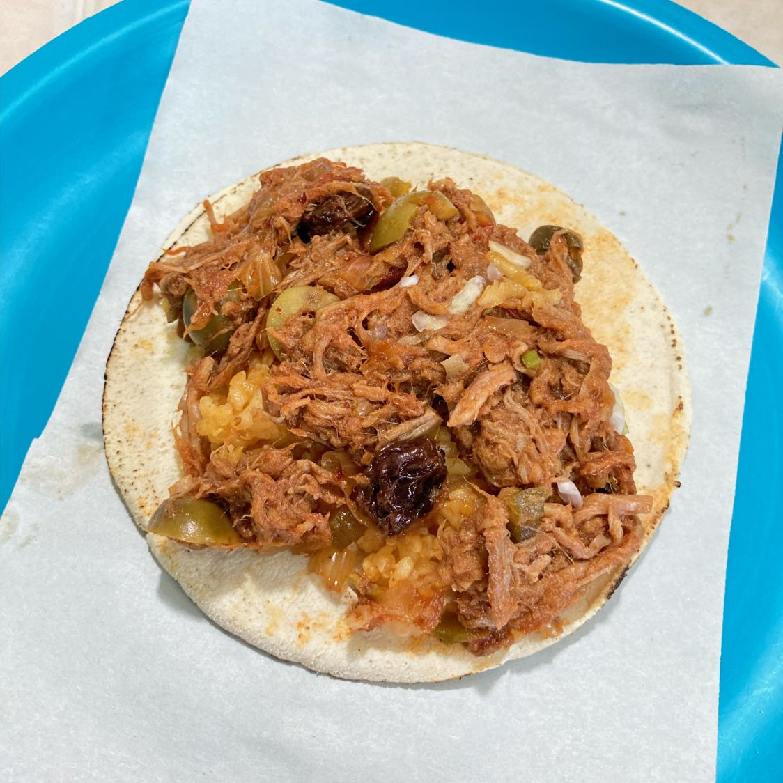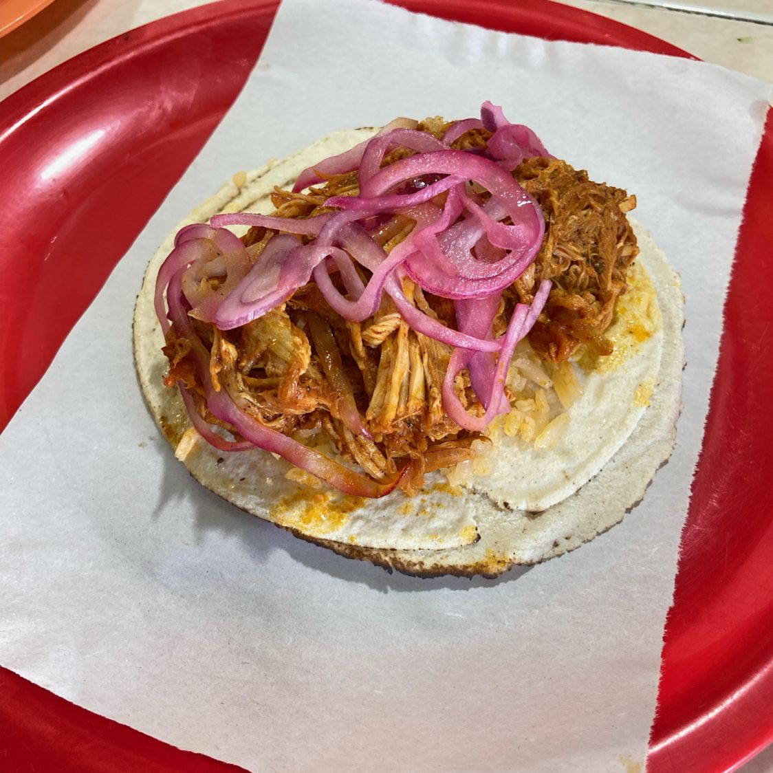 Tortita individual con mayonesa, pibil y cebollita curtida