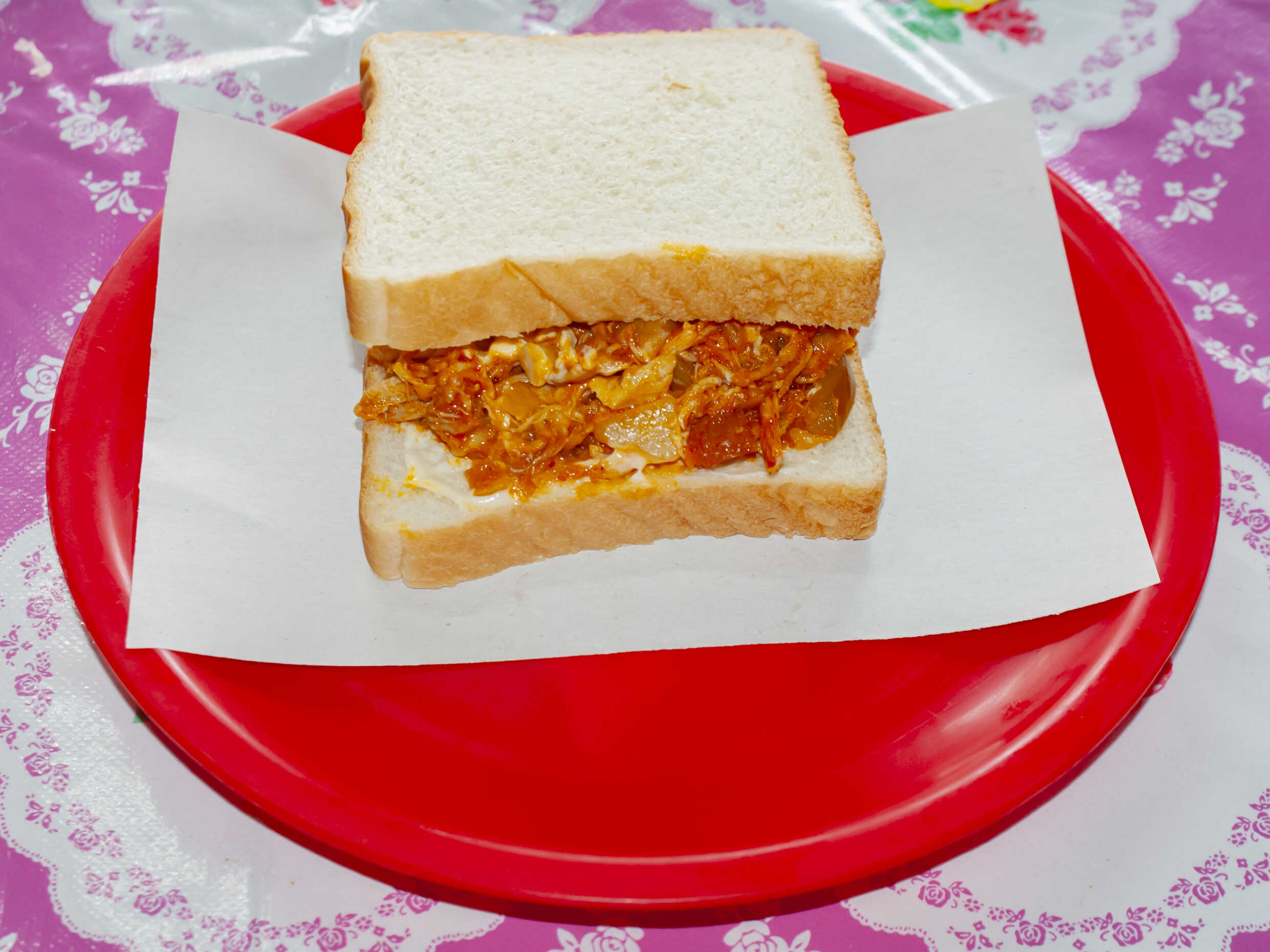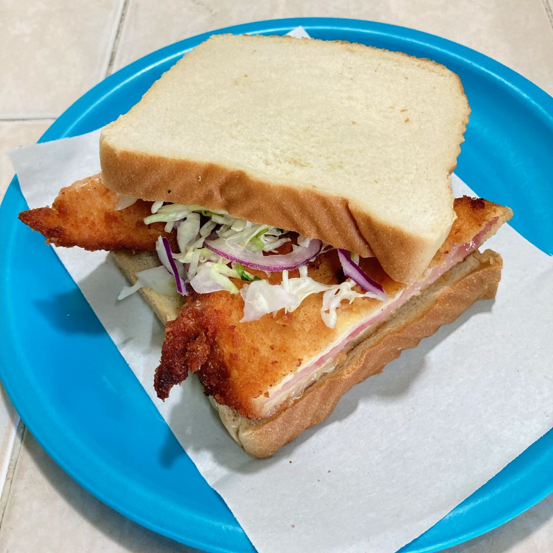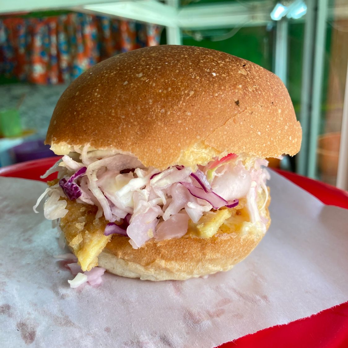 Servido con empanizado, pierna, mayonesa, repollo y catsup.