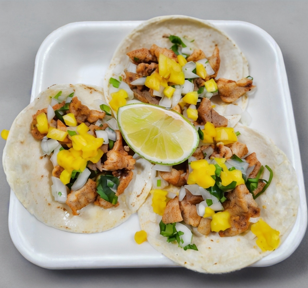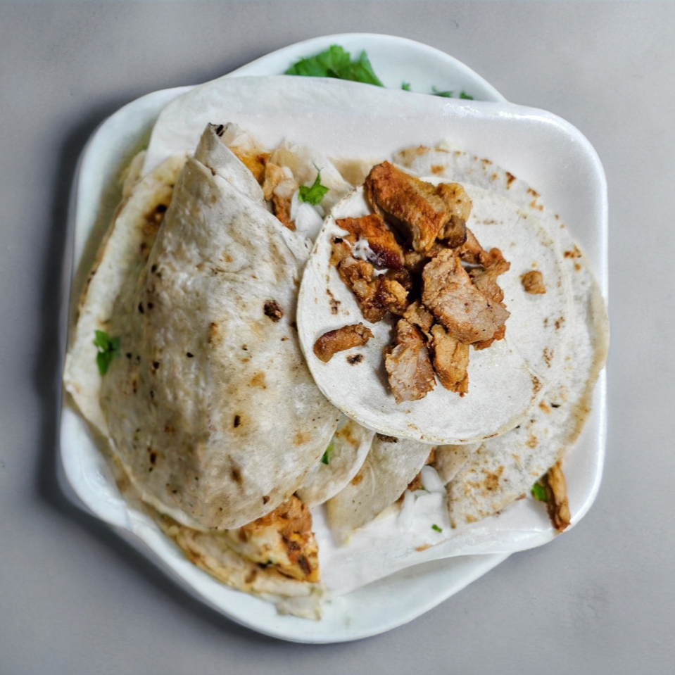 Orden de 3 Pzas.Tortilla de harina, carne de pastor, queso Oaxaca, cebolla, cilantro y piña.