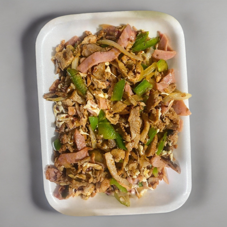 Carne pastor o asada, cebolla, morron, jamon, tocino, queso oaxaca. Acompañado de tortillas.