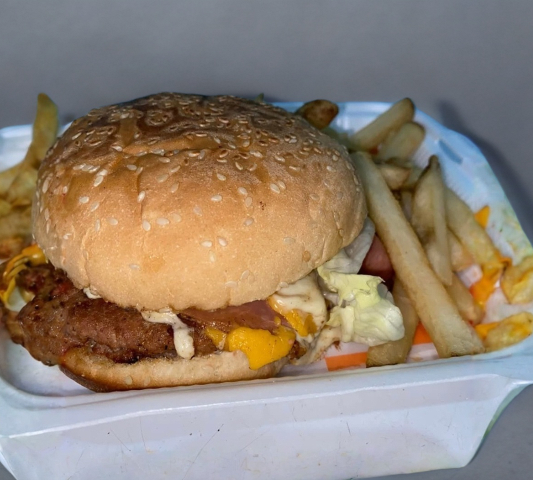 carne de res, mayonesa, catsup, lechuga, jamon, tocino, queso oaxaca, queso amarillo. Acompañado de papas a la francesa.