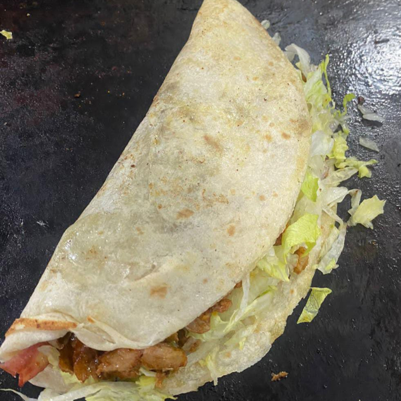 Tortilla de harina Burrera, carne de pastor, jamon, queso oaxaca, lechuga, frijol. Acompaña de salsa de la casa.