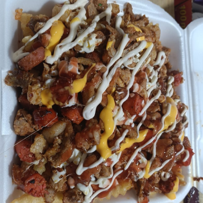 Papas a la francesa, carne de pastor o asada, chistorra, salchicha de pavo, queso oaxaca. Bañada de catsup, queso cheddar y mayonesa. Acompañado de tortillas.
