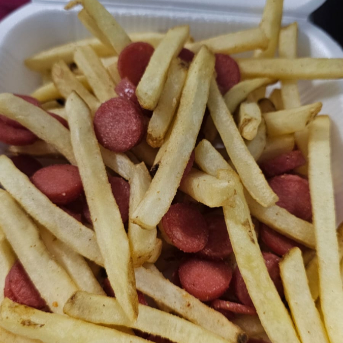 Trocitos de salchicha con papas a la francesa.