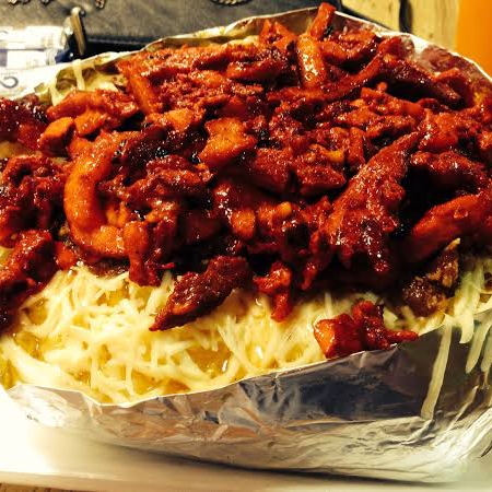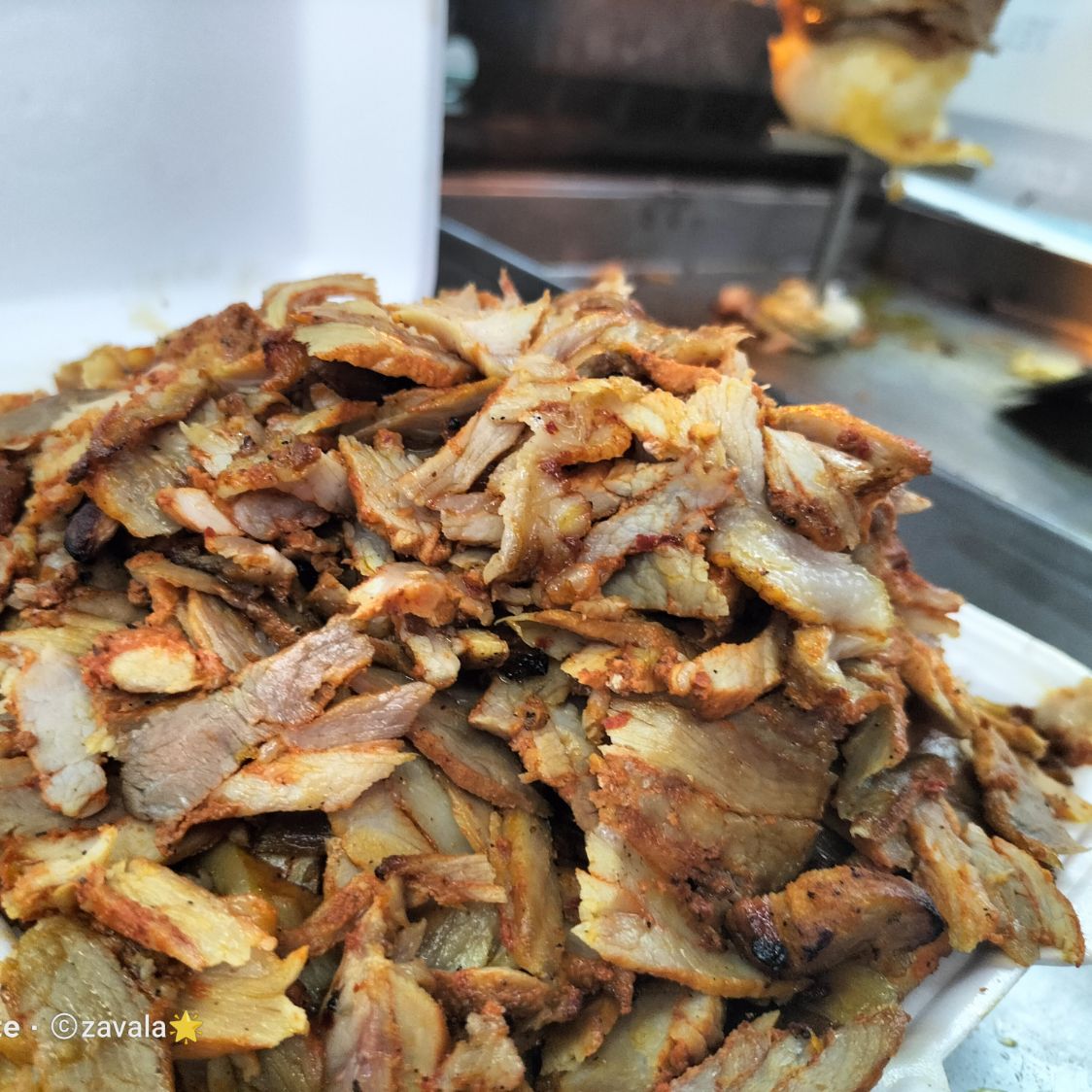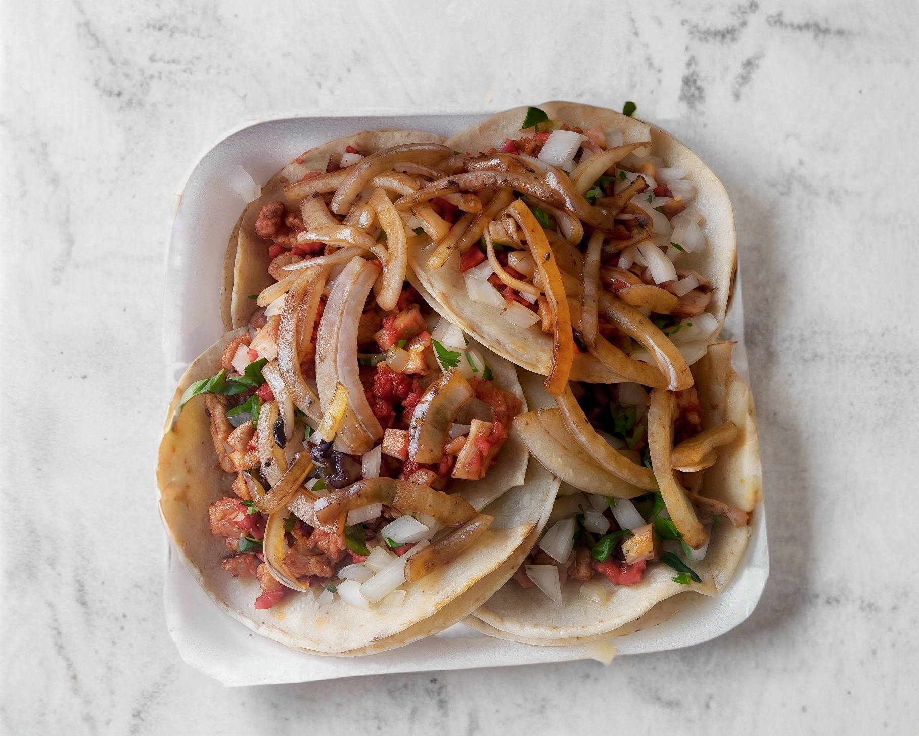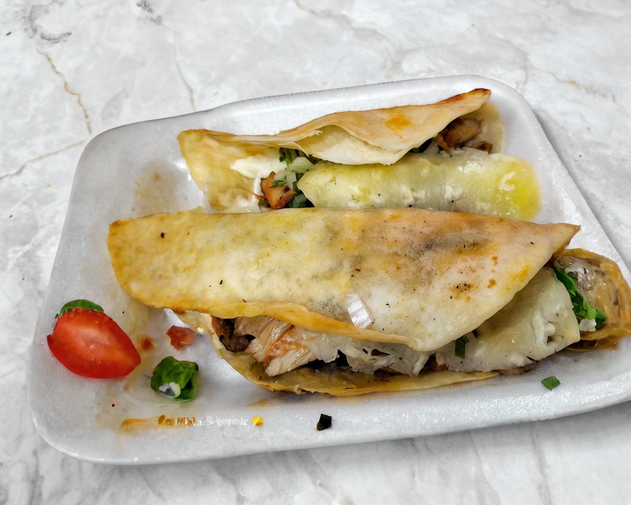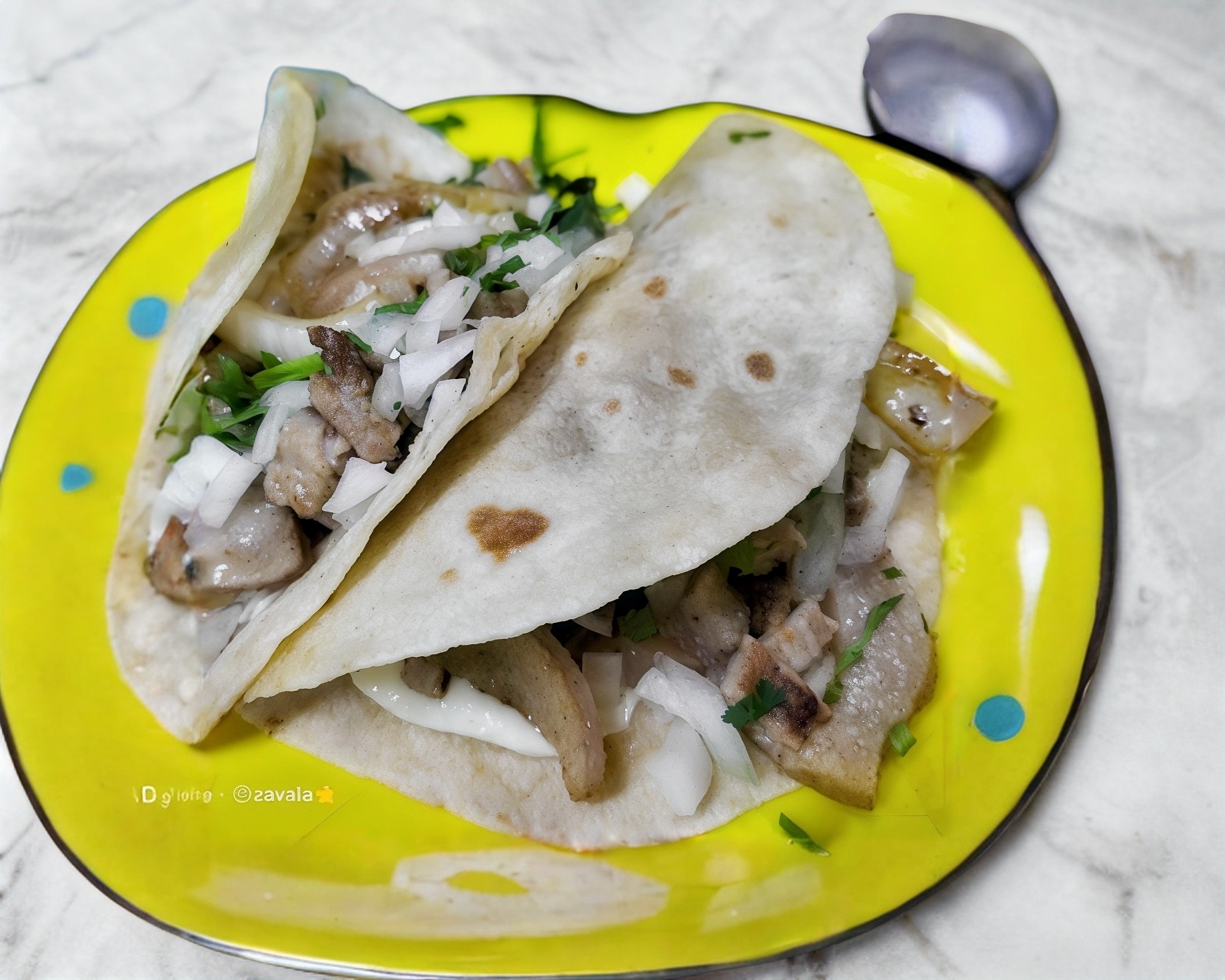 Tortilla de harina con carne al pastor, queso de hebra, cebolla y cilantro.