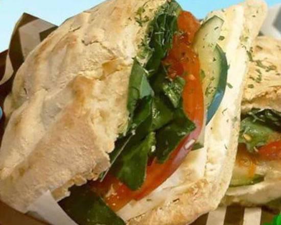 Con pan de vegetales deshidratados, queso crema, jitomate, pepino, queso panela, espinaca y aderezo balsámico.