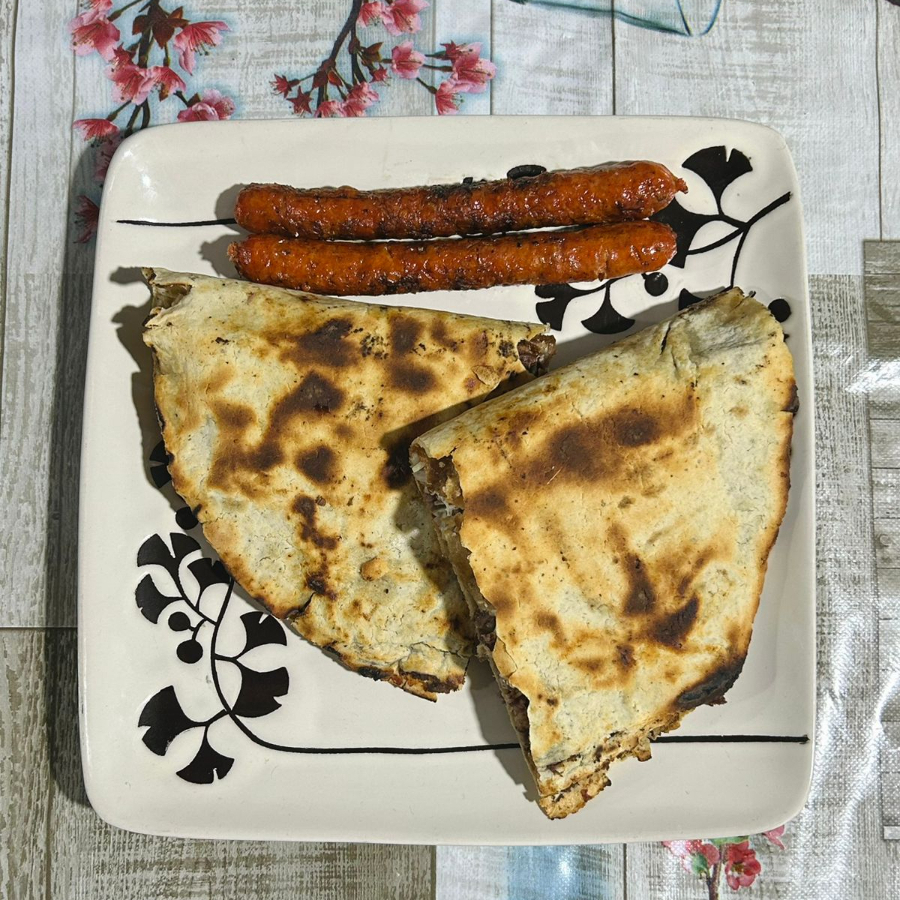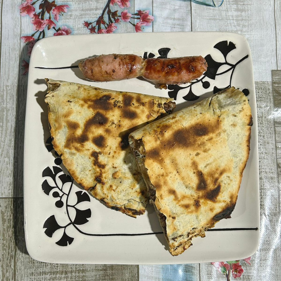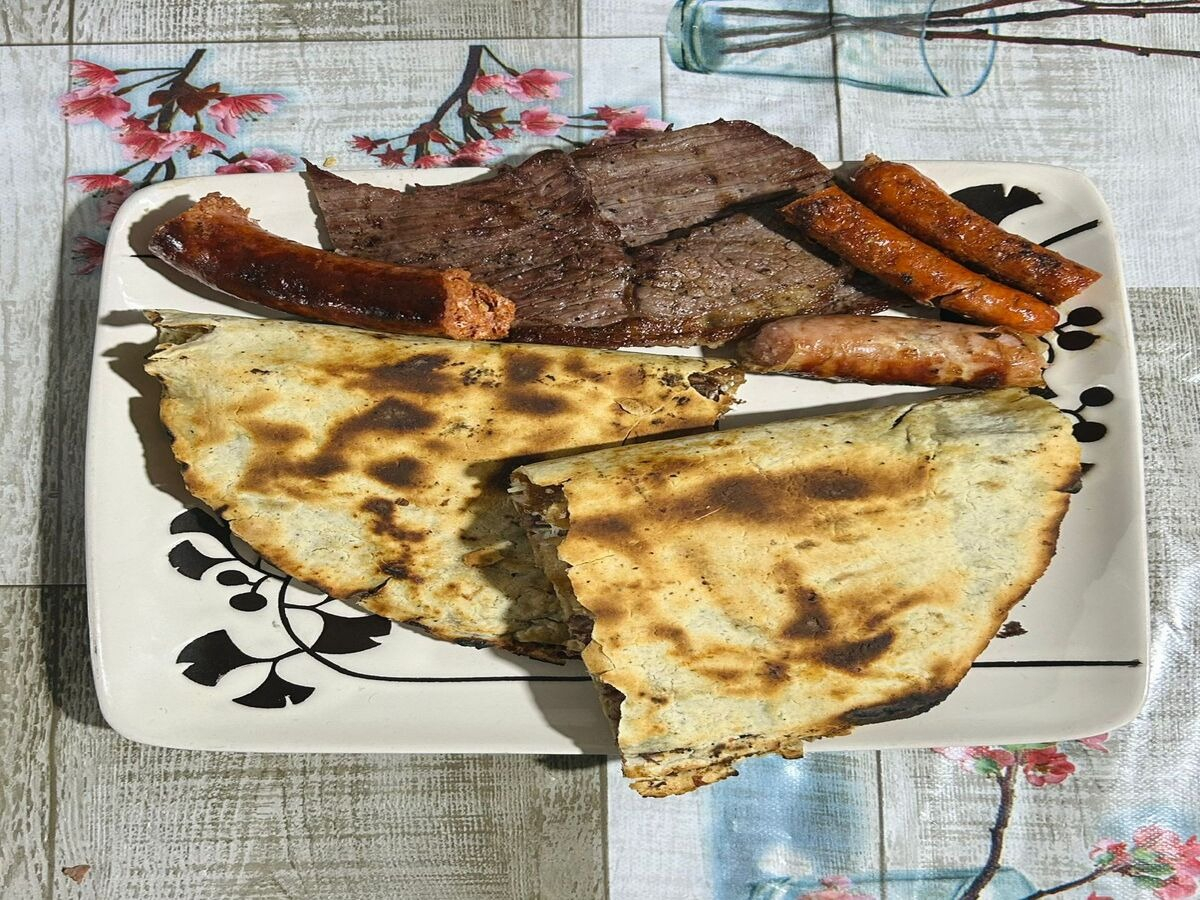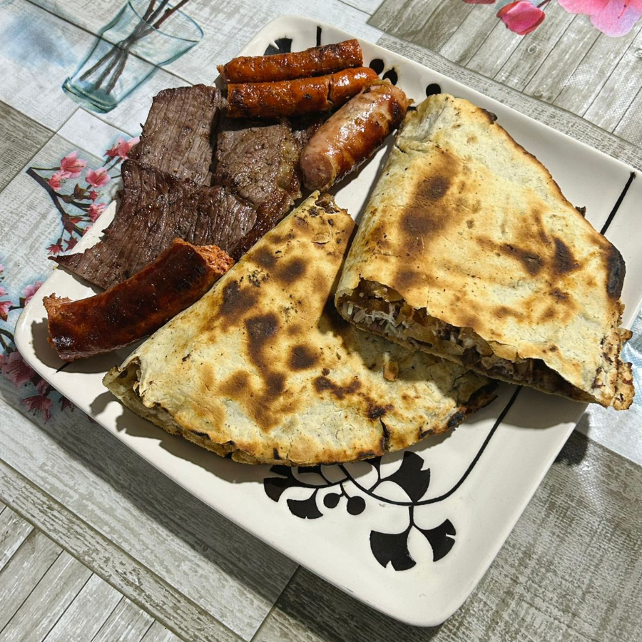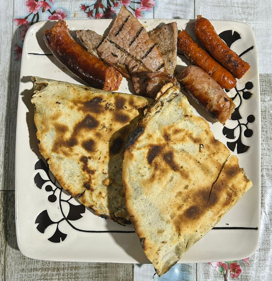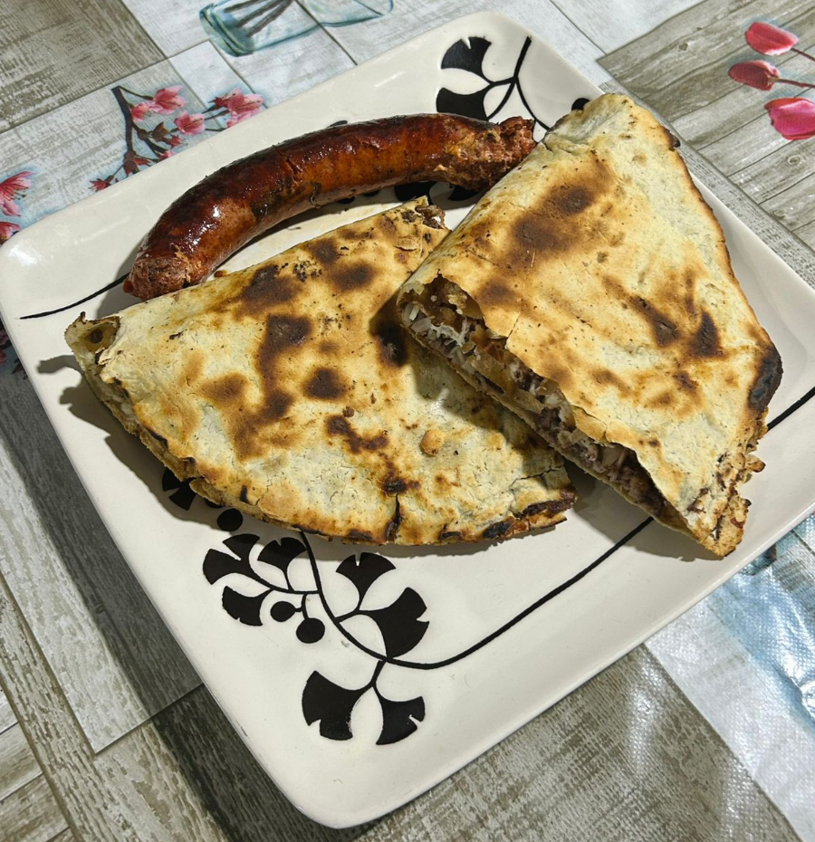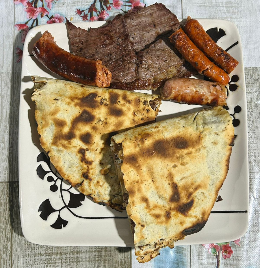 Deliciosa tlayuda de chorizo argentino, preparada con: asiento, frijol, repollo y quesillo.