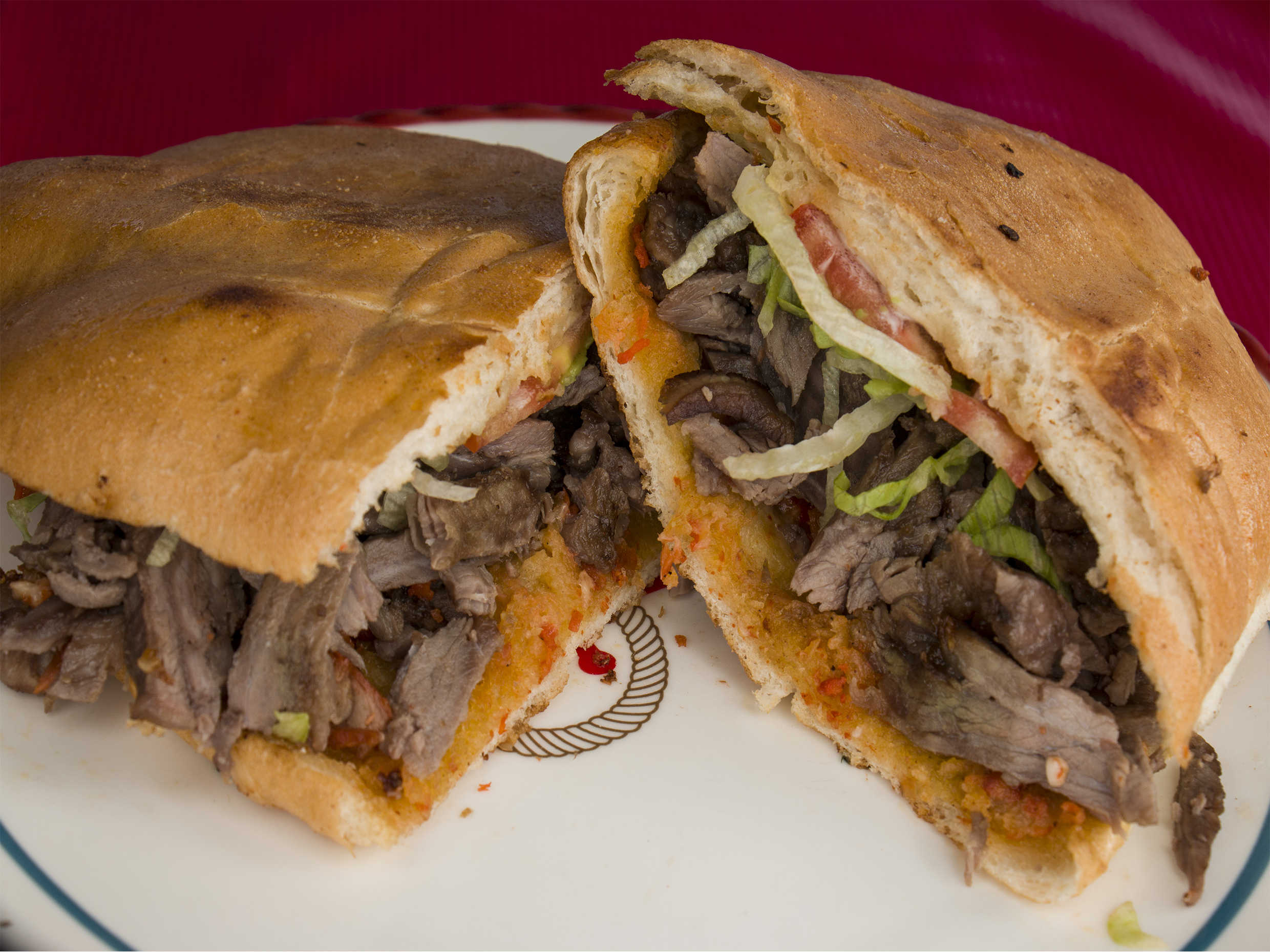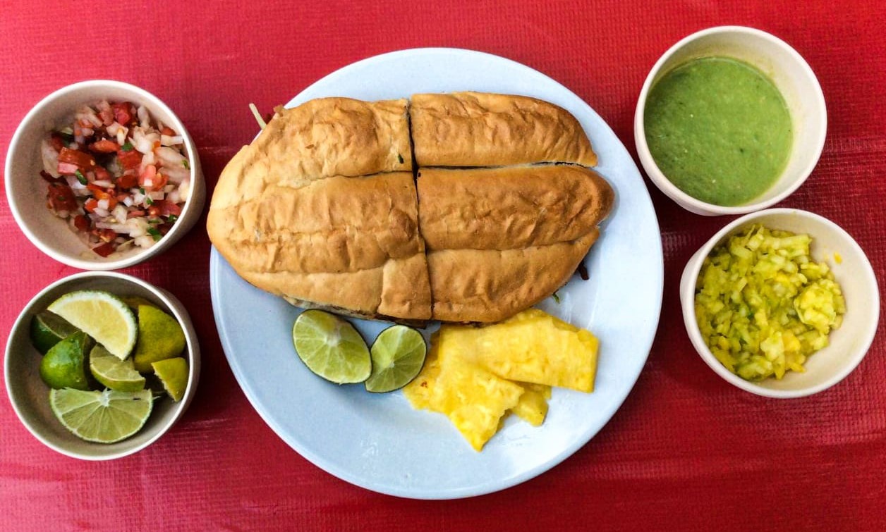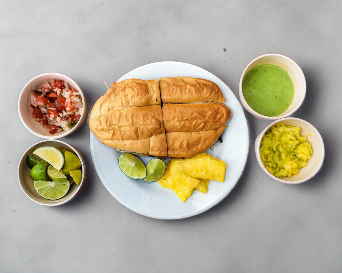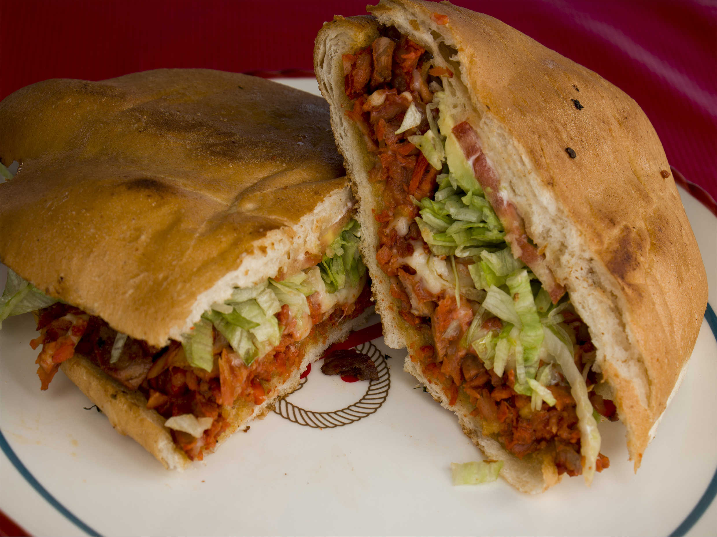 Deliciosa torta de carne al pastor con 2 quesos (Chihuahua y gouda), servida en pan telera doble, con todo (Aguacate, Tomate, y Lechuga) o natural.