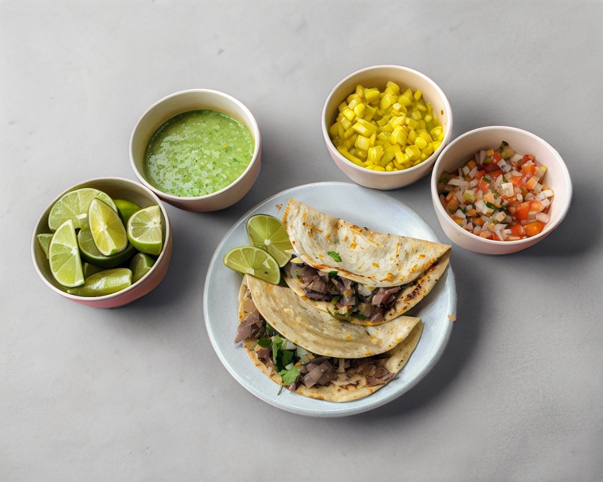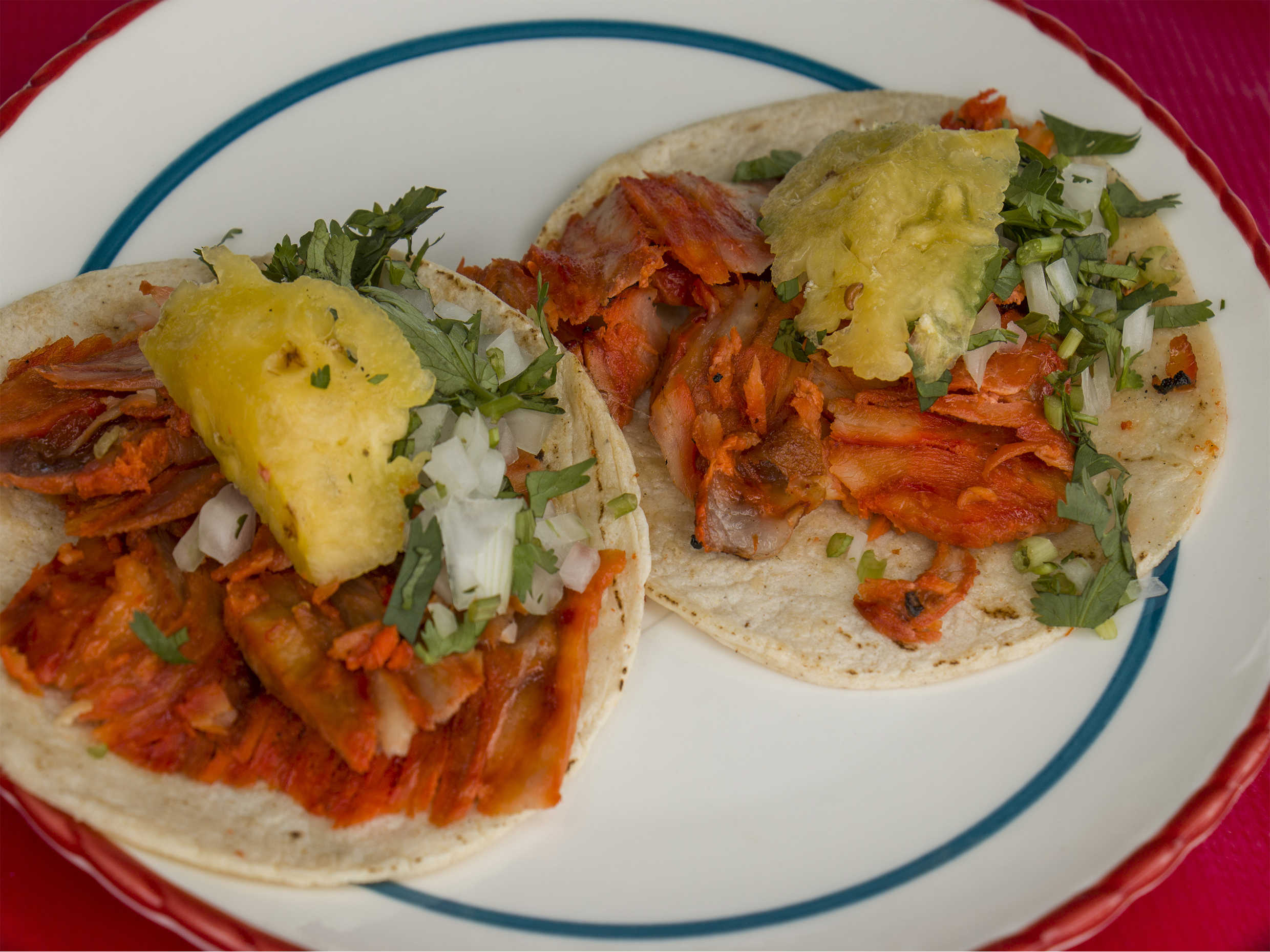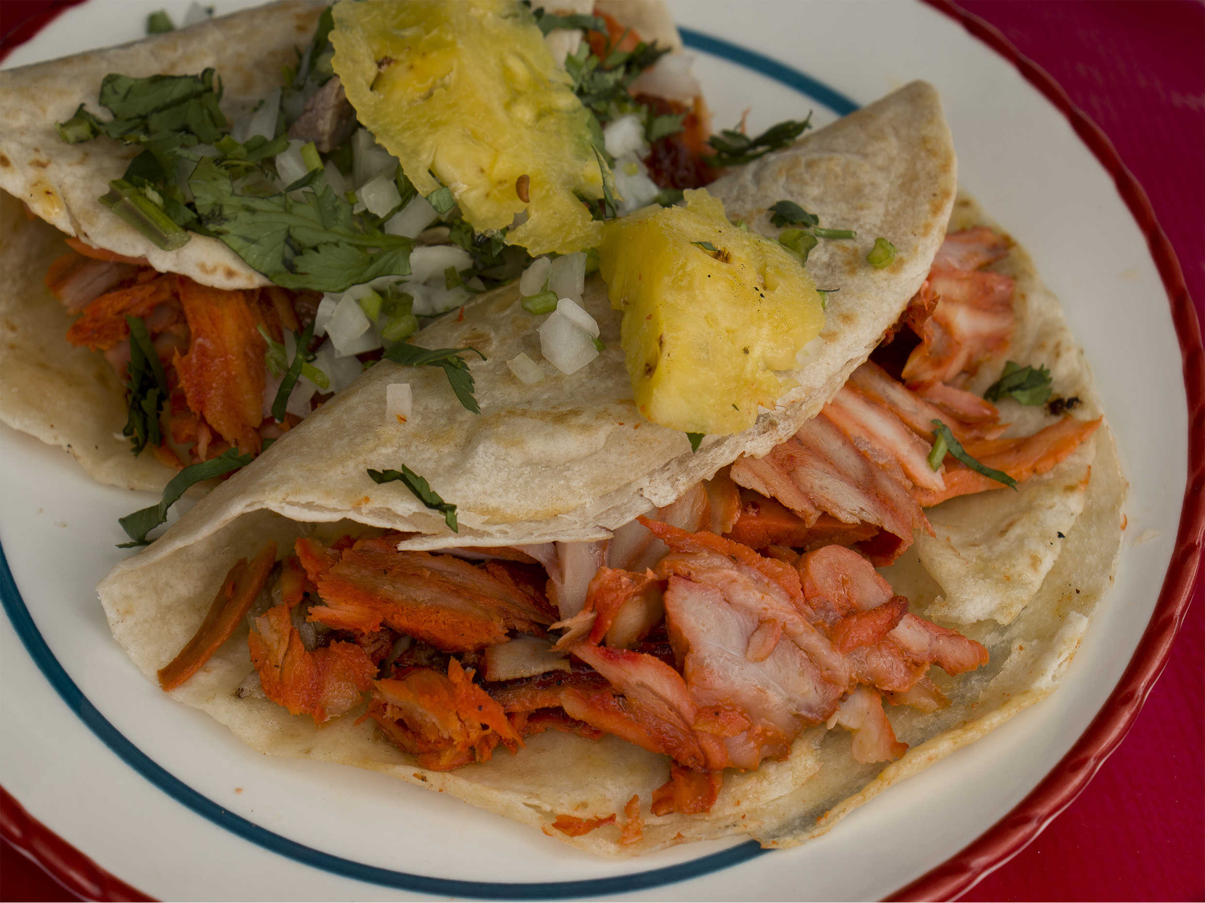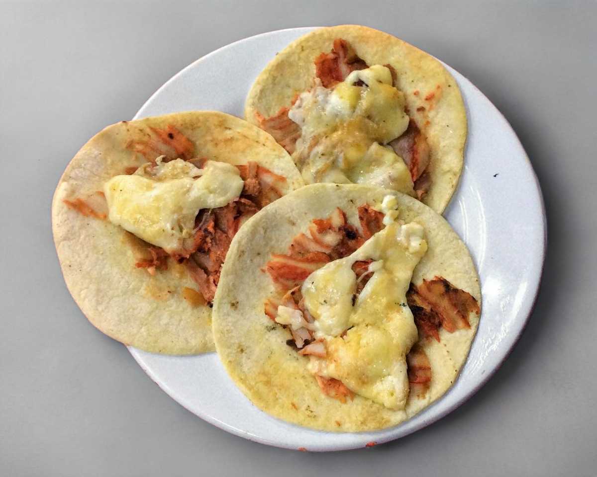 Deliciosos Tacos servidos en tortilla de maíz con carne al pastor preparada a la plancha con queso, servidos con todo (Cebolla, Cilantro, y Piña) o naturales