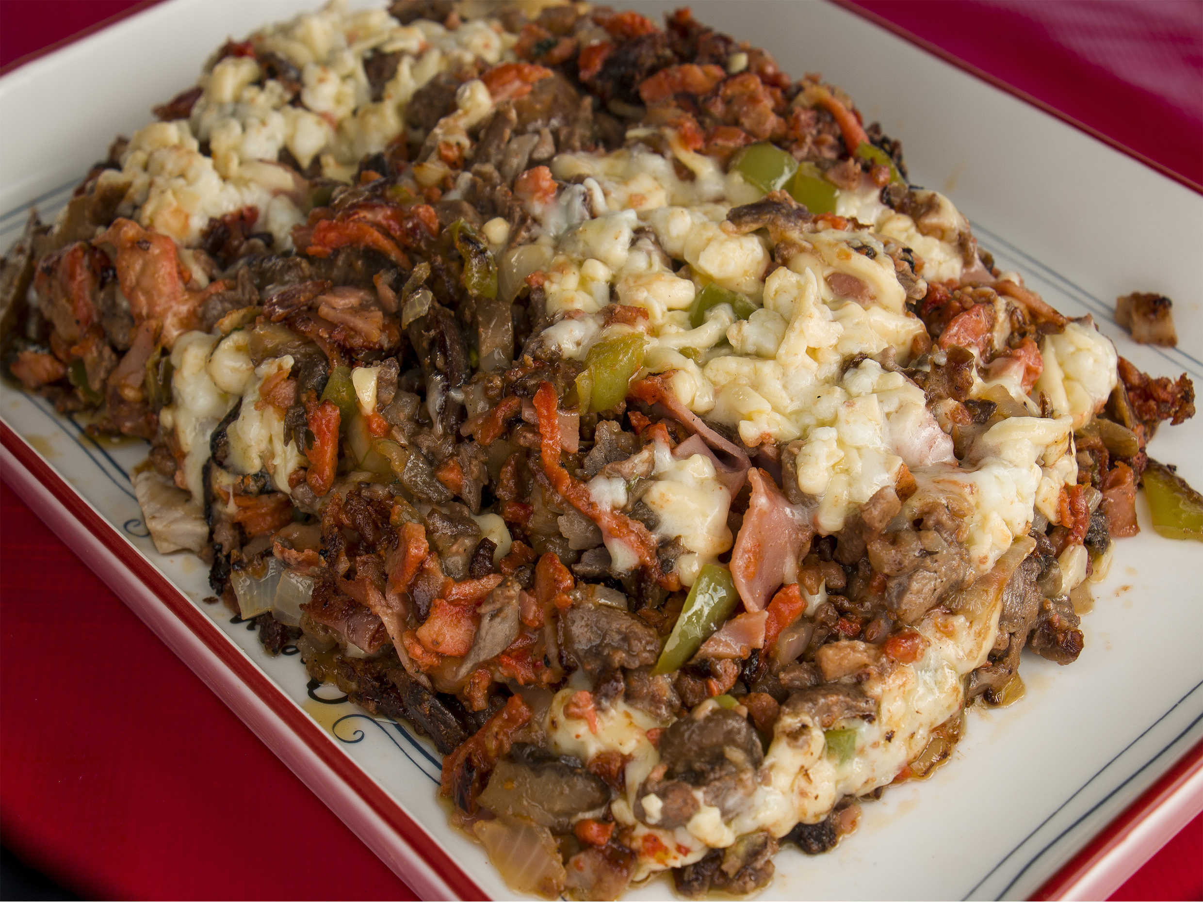 Especialidad para 2 personas, hecha de deliciosa carne al pastor pasada a la plancha con sirloin, chuleta, choriz, champiñones, chile morrón, salchicha, jamon, mezclado con 2 quesos (Chihuahua y gouda)