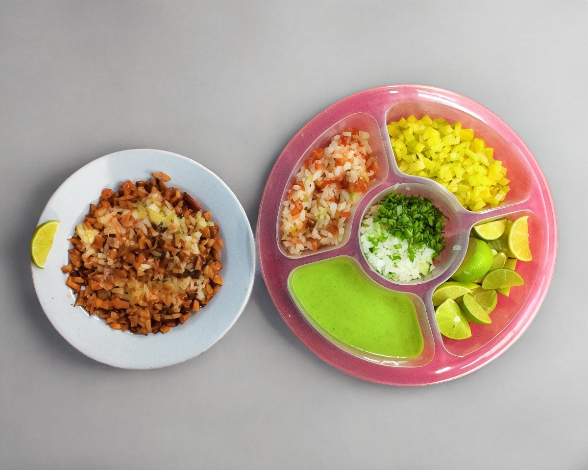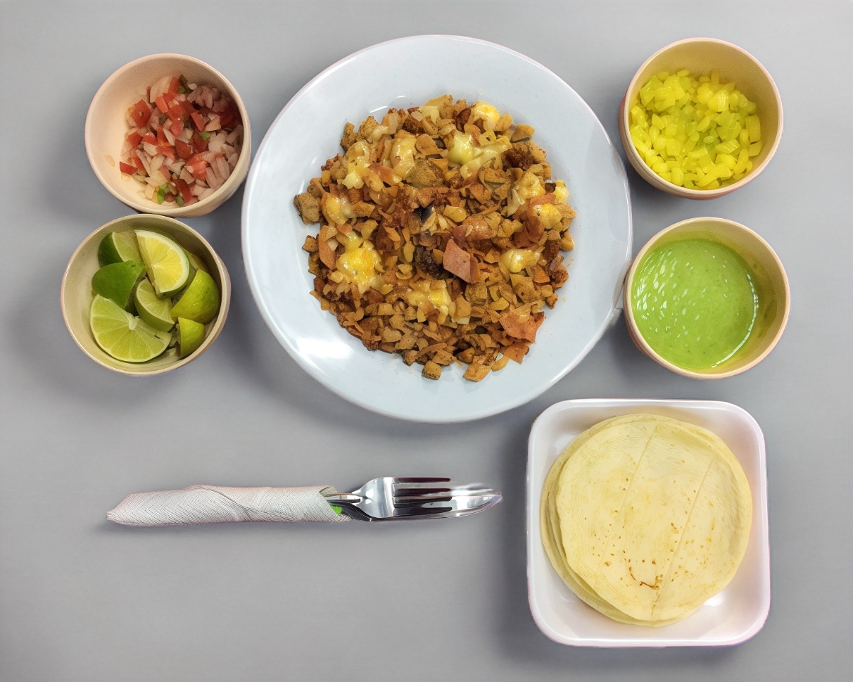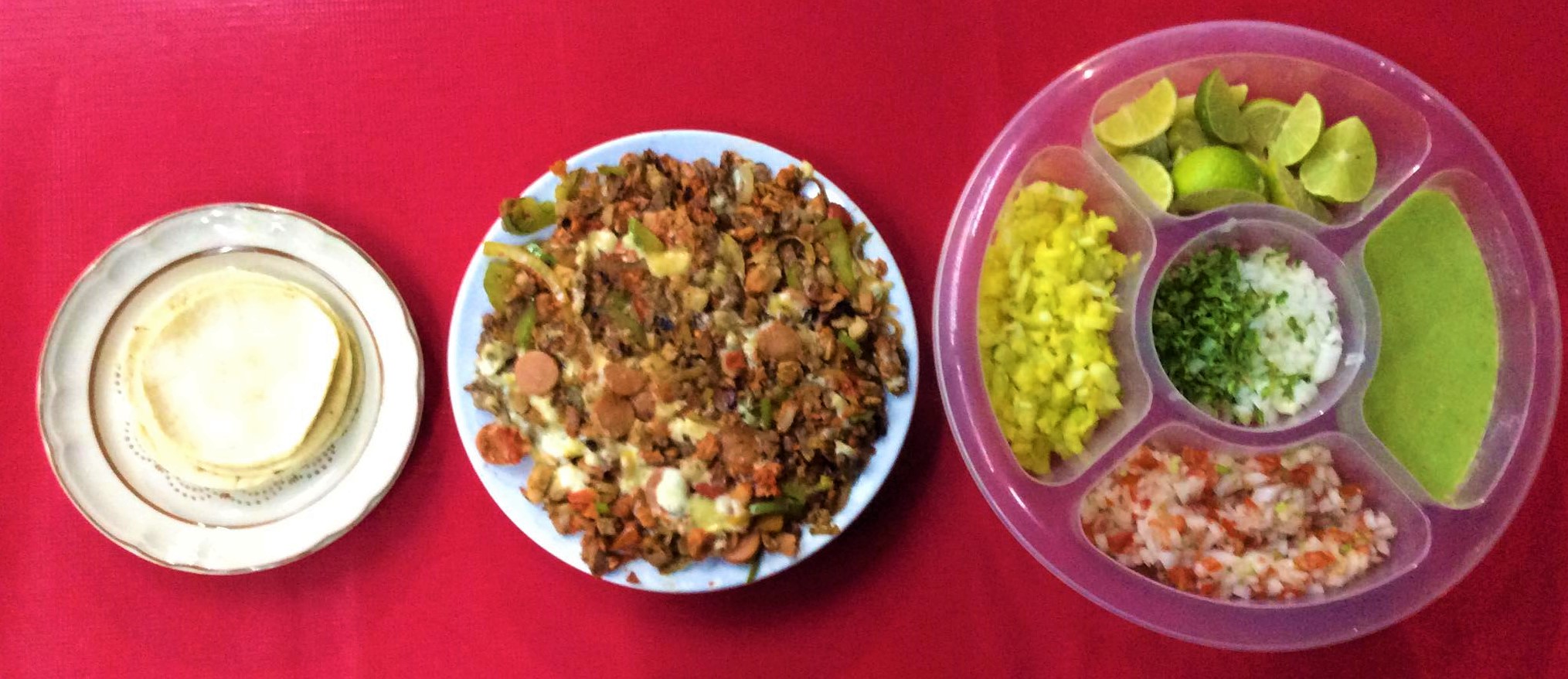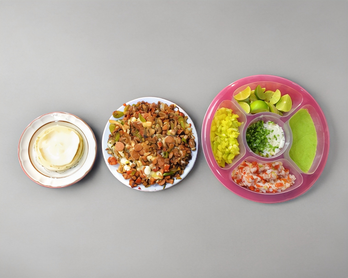 Especialidad de la casa para 2 personas, hecha de deliciosa carne de pastor, Sirloin, chuleta, tocino, jamon, chorizo, cebolla, champiñones, chile morrón, mezclado con 2 quesos (Chihuahua y gouda), incluye tortillas, salsas y limones.