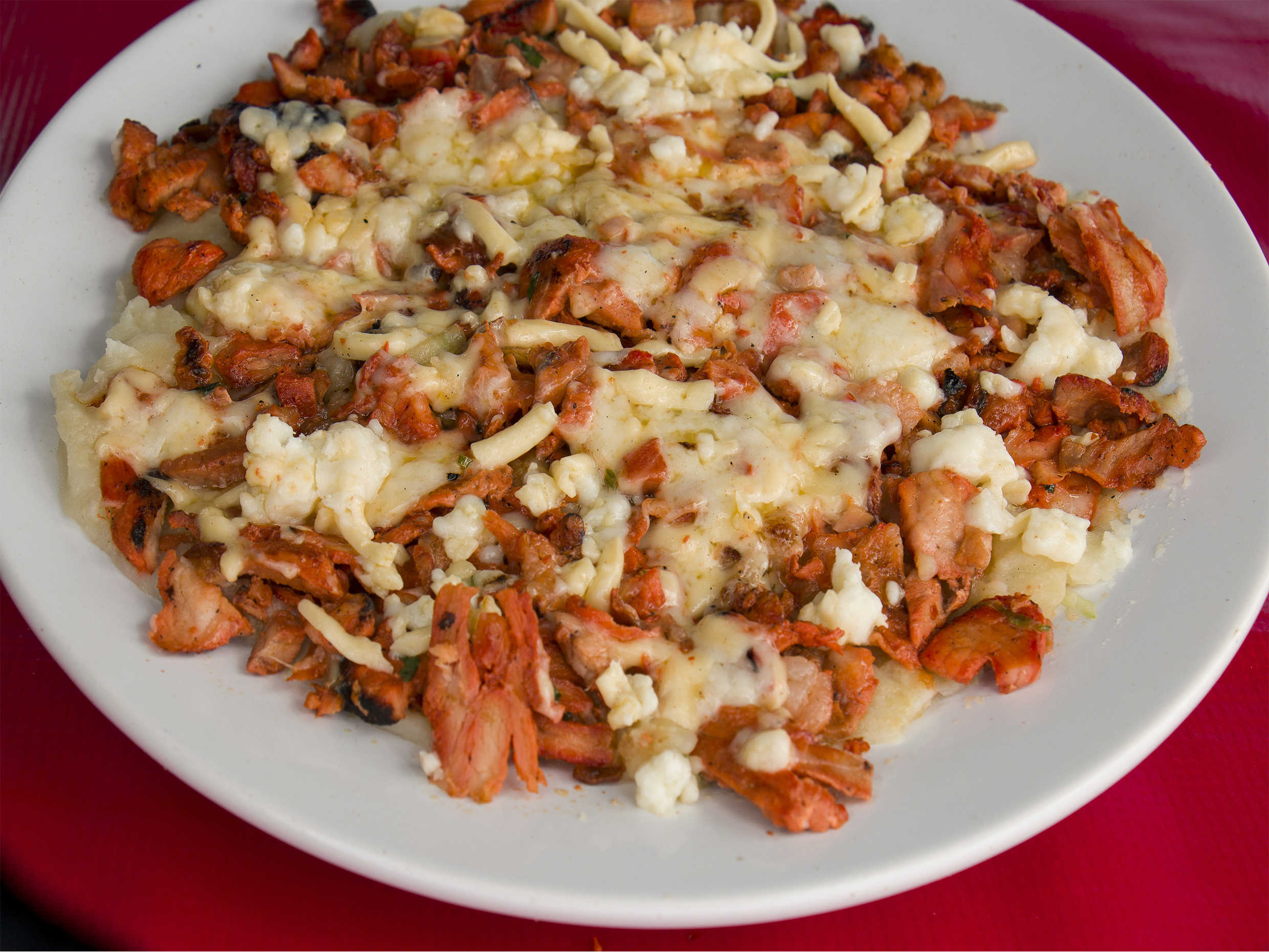 Papapreparada con carne pastor y sirloin con delicioso queso fundido,gouda,Chihuahua y manchego
