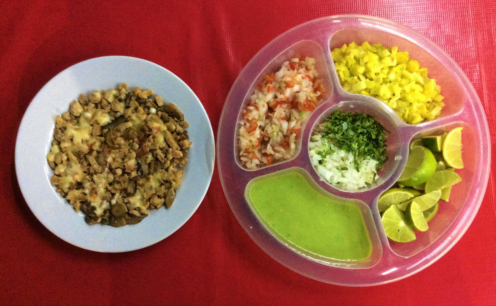 Deliciosa gringa servida en tortilla de harina con carne de chuleta con champiñones con 2 quesos (Chihuahua, gouda) servidas con todo (Cebolla, Cilantro, y Piña) o naturales