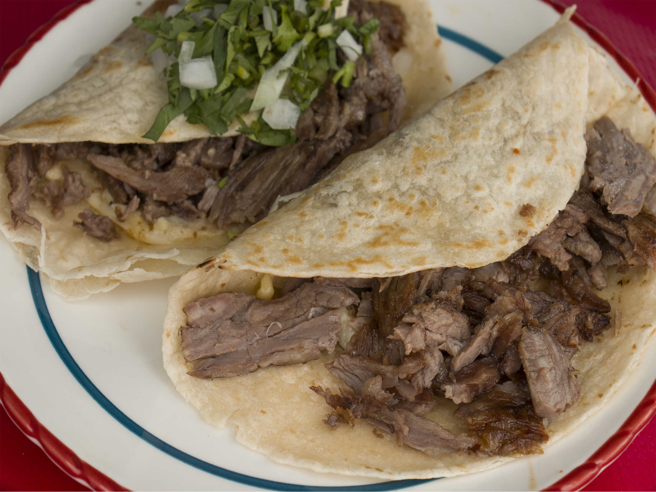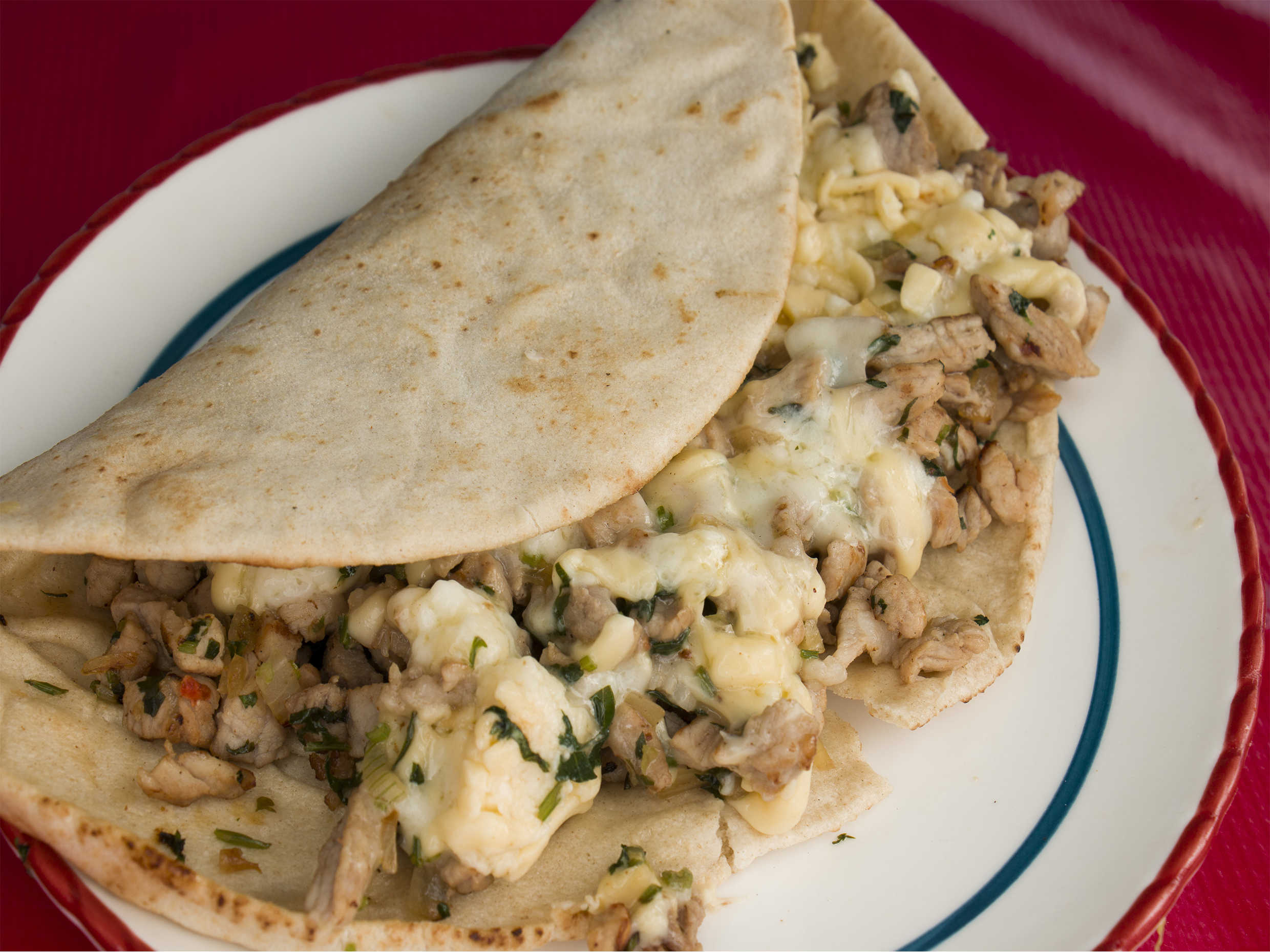 Deliciosa carne de chuleta de cerdo precocida a la plancha con cebolla y cilantro con 2 quesos (Chihuahua y gouda) , servida en tortilla de Pan Pita.