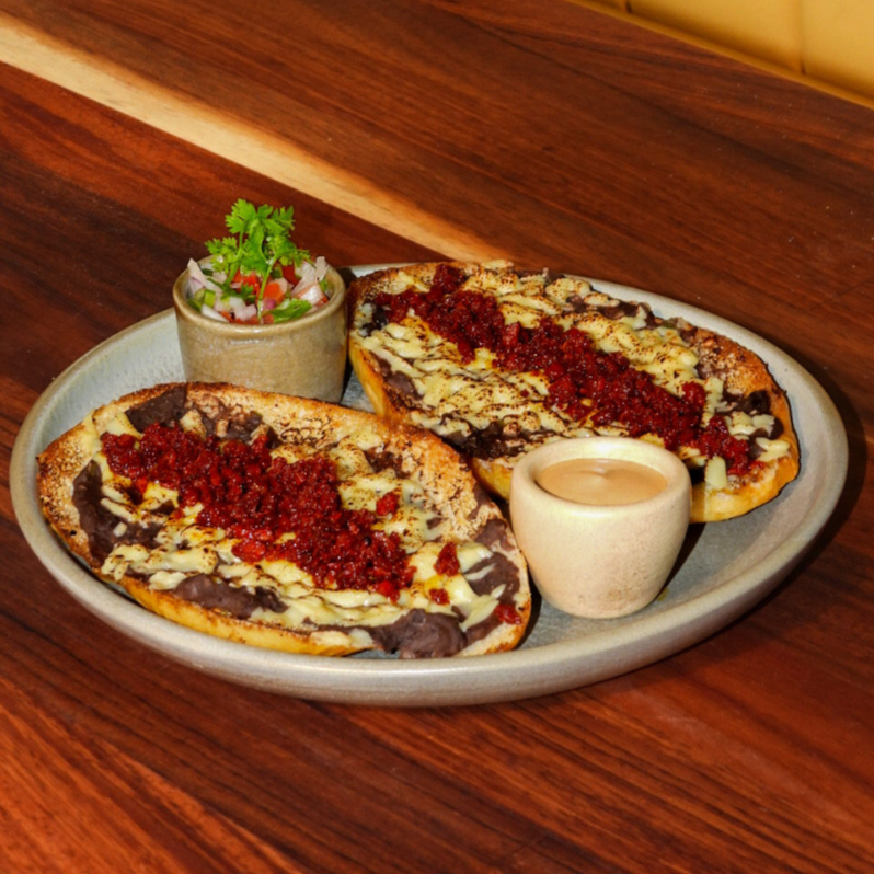 Clásicas rebanadas de telera con frijol refrito, queso gratinado y pico de gallo