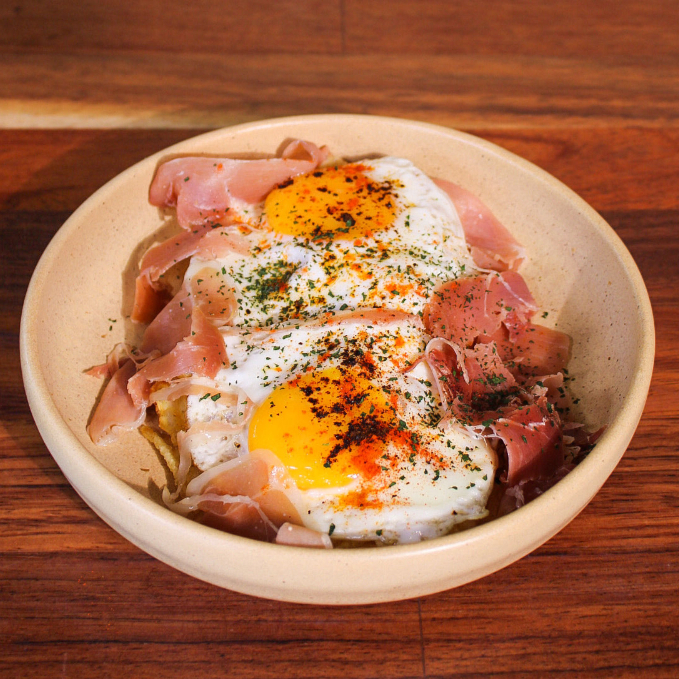 Al más puro estilo de la madre patria, huevos tiernos montados sobre papas chips y polvo de chorizo. Agrega extra: Jamón serrano o longaniza y tocino