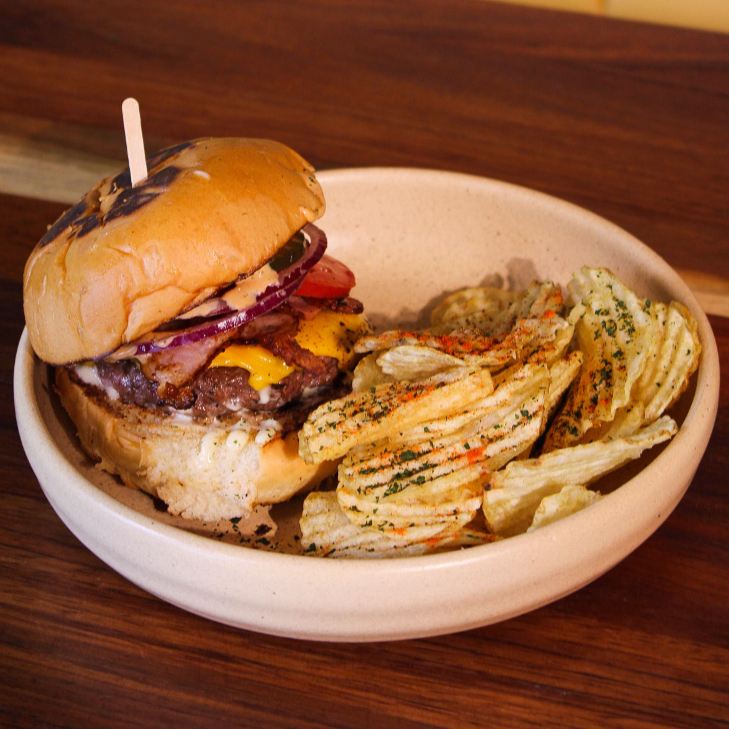 Con pan de la casa con pollo planchado, pesto, jitomates cherry rostizados, toque de reducción balsamica y mucho queso fundido. Escoge entre papas chips o ensalada de la casa.