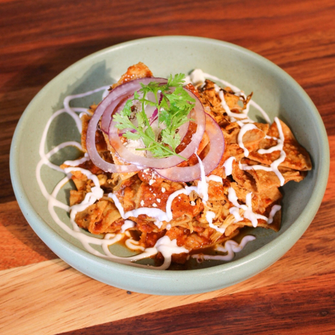 Relleno de chilaquiles con queso, crema, cebolla, cilantro y aguacate