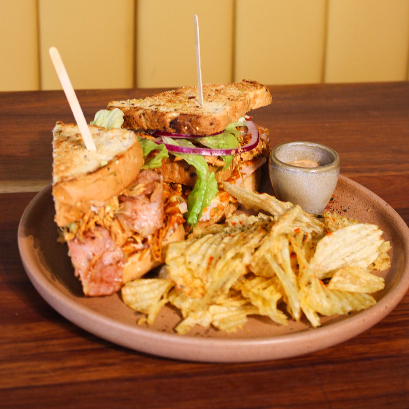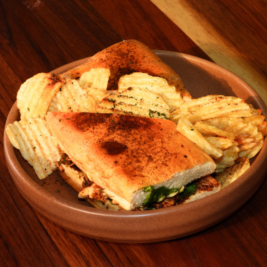 Nuestro entrepan más llenador, con pollo salteado, jamón, queso, tocino, aderezo de chipotle y ajo. Acompañado de papas chips.