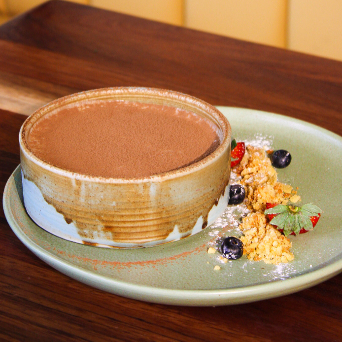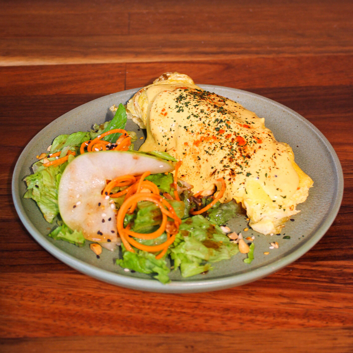Relleno de cherrys asados, queso de cabra y pesto, gratinado con salsa holandesa y acompañado de tosta de pan madre y ensalada de la casa