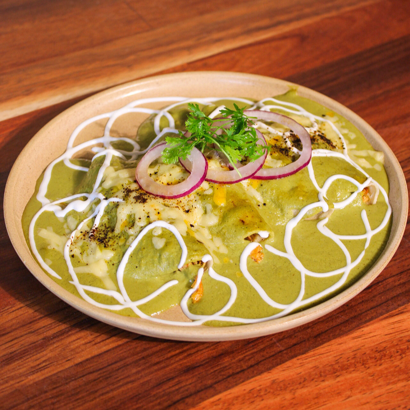 Unas suizas bien mexicanas, rellenas de pollito guisado, bañadas en salsa verde gratinadas con queso y acompañadas de frijolitos refritos y cilantro