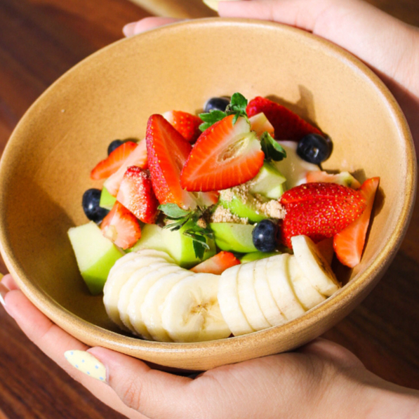 Manzana verde picada, plátano, fresas y blueberries, con yogurt griego y polvo de granola.