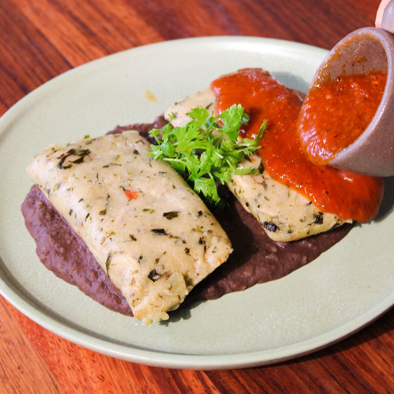 Dos suaves tamales, revueltos con sartén de cebolla y tomate, sobre espejo de frijol y salsa roja