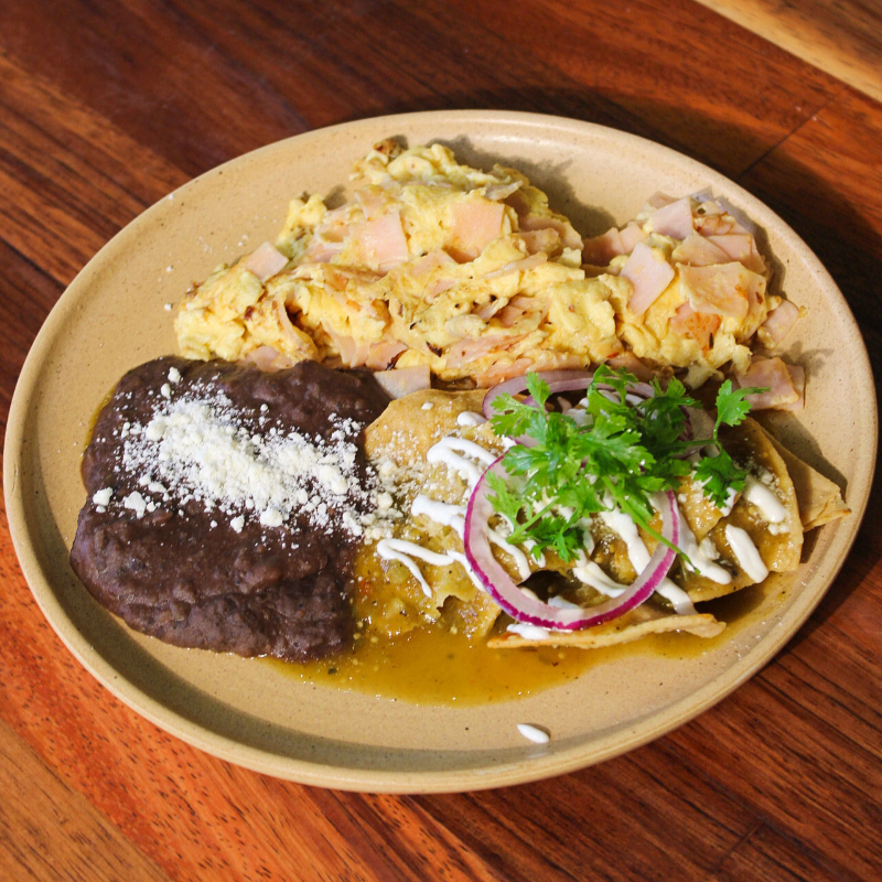 Huevos revueltos al gusto. Puedes pedirlos a la mexicana, champiñones, jamón, tocino, longaniza o queso manchego. Acompañados de frijoles refritos y una pequeña porción de chilaquiles verdes o rojos.