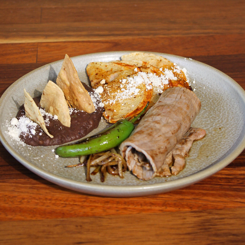 Artesanal a sazonada a la plancha con frijolitos refritos, queso, tortillas, y chiles