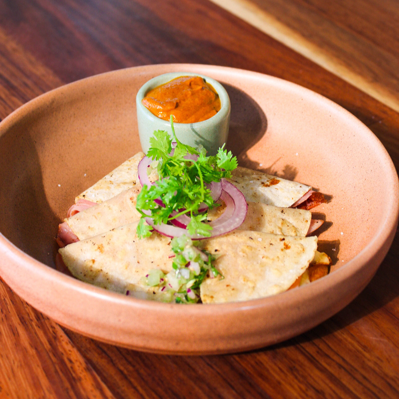 Con tortilla de maíz, rellenas de huitlacoche, flor de calabaza y hongos en escabechado, sobre una cama de salsa verde y frijolitos refritos