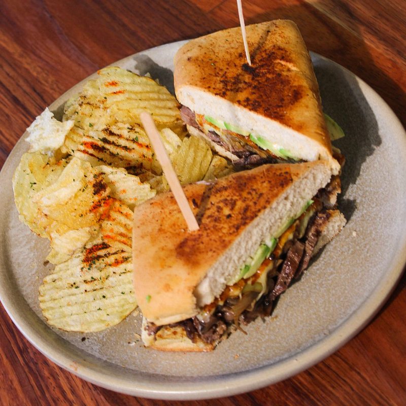 Con pan de la casa, frijoles, aioli, arrachera outside gratinada con champiñones y cebolla asada y aguacate. Escoge entre papas chips o ensalada de la casa.