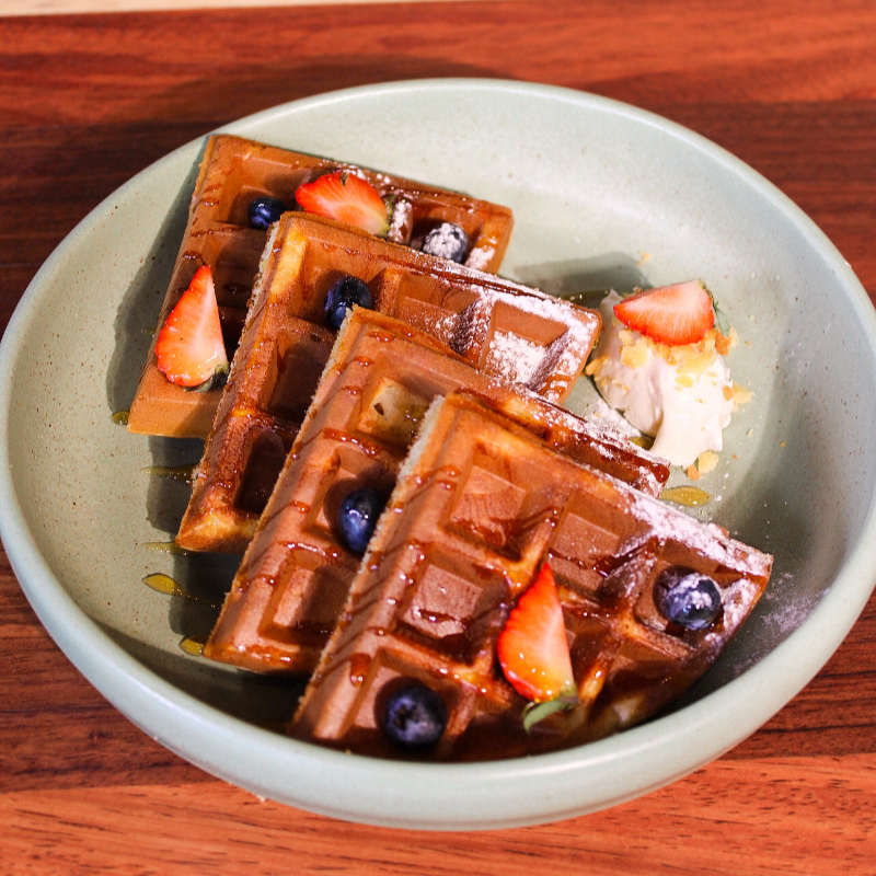 Una pieza en crujiente y esponjosa de waffle espolvoreados de azúcar glass y acompañados de frutos del bosque y sirope de frutos rojos