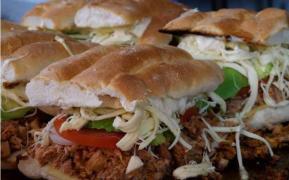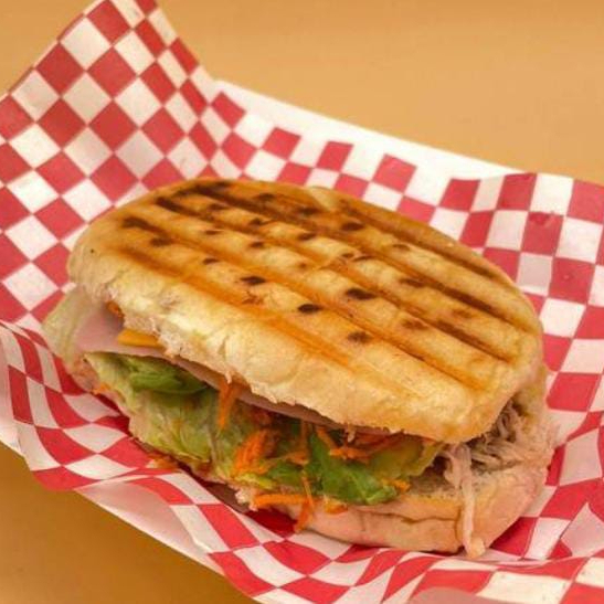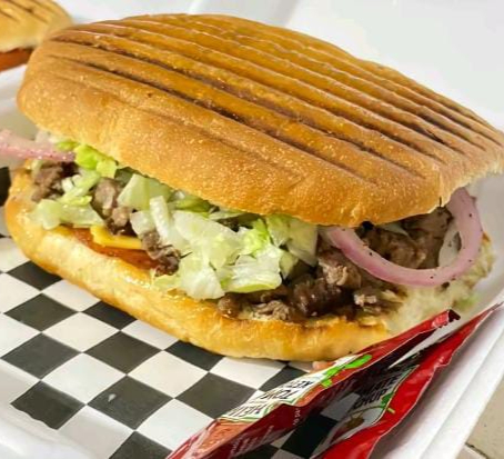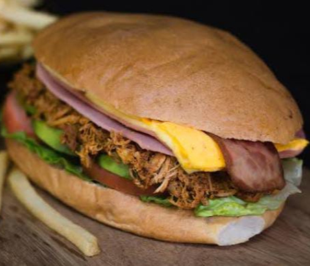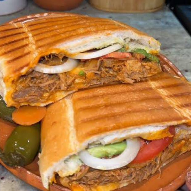 Platillo personal, pan grande telera doble, pierna de cerdo asada (sirloin), chorizo, milanesa empanizada de pollo, queso americano, BBQ opcional, frijol, mayonesa, lechuga, cebolla morada curtida, media crema y queso.