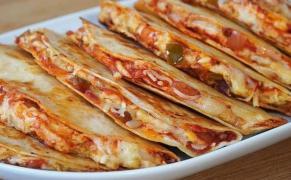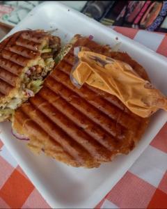 Tortilla de harina al comal, pierna especial, milanesa empanizado, queso Oaxaca y cebolla morada curtida.